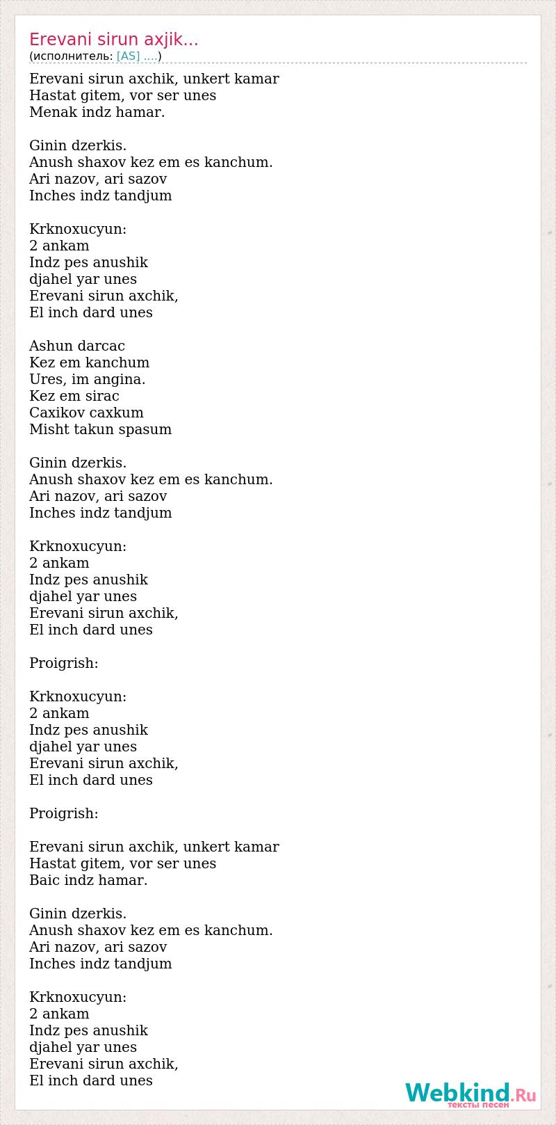 Erevani sirun axchik, unkert kamar Hastat gitem, vor ser unes Menak indz hamar. Ginin dzerkis. Anush shaxov kez em es kanchum. Ari nazov, ari sazov Inches indz tandjum Krknoxucyun: 2 ankam Indz pes anushik djahel yar unes Erevani sirun axchik, El inch dard unes Ashun darcac Kez em kanchum Ures, im angina. Kez em sirac Caxikov caxkum Misht takun spasum Ginin dzerkis. Anush shaxov kez em es kanchum. Ari nazov, ari sazov Inches indz tandjum Krknoxucyun: 2 ankam Indz pes anushik djahel yar unes Erevani sirun axchik, El inch dard unes Proigrish: Krknoxucyun: 2 ankam Indz pes anushik djahel yar unes Erevani sirun axchik, El inch dard unes Proigrish: Erevani sirun axchik, unkert kamar Hastat gitem, vor ser unes Baic indz hamar. Ginin dzerkis. Anush shaxov kez em es kanchum. Ari nazov, ari sazov Inches indz tandjum Krknoxucyun: 2 ankam Indz pes anushik djahel yar unes Erevani sirun axchik, El inch dard unes