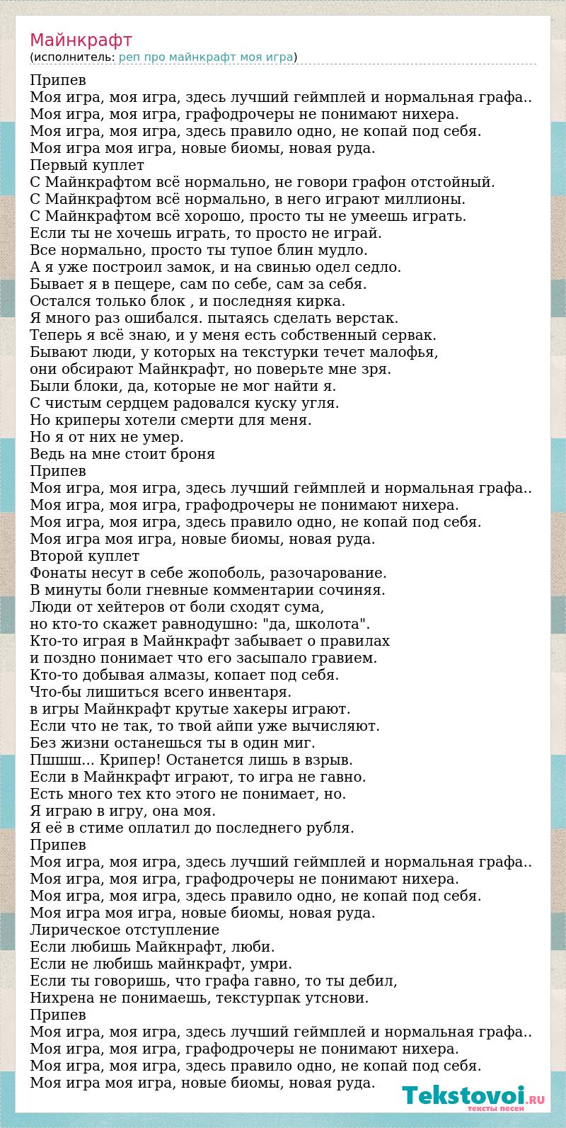 Припев Моя игра, моя игра, здесь лучший геймплей и нормальная графа.. Моя игра, моя игра, графодрочеры не понимают нихера. Моя игра, моя игра, здесь правило одно, не копай под себя. Моя игра моя игра, новые биомы, новая руда. Первый куплет С Майнкрафтом всё нормально, не говори графон отстойный. С Майнкрафтом всё нормально, в него играют миллионы. С Майнкрафтом всё хорошо, просто ты не умеешь играть. Если ты не хочешь играть, то просто не играй. Все нормально, просто ты тупое блин мудло. А я уже построил замок, и на свинью одел седло. Бывает я в пещере, сам по себе, сам за себя. Остался только блок , и последняя кирка. Я много раз ошибался. пытаясь сделать верстак. Теперь я всё знаю, и у меня есть собственный сервак. Бывают люди, у которых на текстурки течет малофья, они обсирают Майнкрафт, но поверьте мне зря. Были блоки, да, которые не мог найти я. С чистым сердцем радовался куску угля. Но криперы хотели смерти для меня. Но я от них не умер. Ведь на мне стоит броня Припев Моя игра, моя игра, здесь лучший геймплей и нормальная графа.. Моя игра, моя игра, графодрочеры не понимают нихера. Моя игра, моя игра, здесь правило одно, не копай под себя. Моя игра моя игра, новые биомы, новая руда. Второй куплет Фонаты несут в себе жопоболь, разочарование. В минуты боли гневные комментарии сочиняя. Люди от хейтеров от боли сходят сума, но кто-то скажет равнодушно: "да, школота". Кто-то играя в Майнкрафт забывает о правилах и поздно понимает что его засыпало гравием. Кто-то добывая алмазы, копает под себя. Что-бы лишиться всего инвентаря. в игры Майнкрафт крутые хакеры играют. Если что не так, то твой айпи уже вычисляют. Без жизни останешься ты в один миг. Пшшш... Крипер! Останется лишь в взрыв. Если в Майнкрафт играют, то игра не гавно. Есть много тех кто этого не понимает, но. Я играю в игру, она моя. Я её в стиме оплатил до последнего рубля. Припев Моя игра, моя игра, здесь лучший геймплей и нормальная графа.. Моя игра, моя игра, графодрочеры не понимают нихера. Моя игра, моя игра, здесь правило одно, не копай под себя. Моя игра моя игра, новые биомы, новая руда. Лирическое отступление Если любишь Майкнрафт, люби. Если не любишь майнкрафт, умри. Если ты говоришь, что графа гавно, то ты дебил, Нихрена не понимаешь, текстурпак утснови. Припев Моя игра, моя игра, здесь лучший геймплей и нормальная графа.. Моя игра, моя игра, графодрочеры не понимают нихера. Моя игра, моя игра, здесь правило одно, не копай под себя. Моя игра моя игра, новые биомы, новая руда.