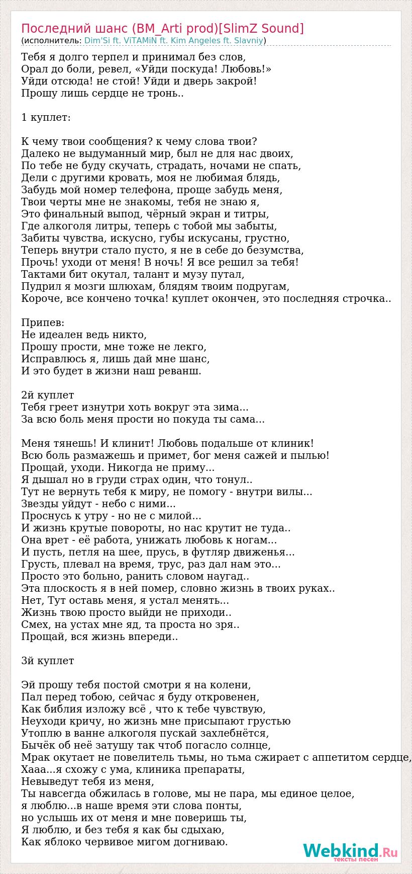 Тебя я долго терпел и принимал без слов, Орал до боли, ревел, «Уйди поскуда! Любовь!» Уйди отсюда! не стой! Уйди и дверь закрой! Прошу лишь сердце не тронь.. 1 куплет: К чему твои сообщения? к чему слова твои? Далеко не выдуманный мир, был не для нас двоих, По тебе не буду скучать, страдать, ночами не спать, Дели с другими кровать, моя не любимая блядь, Забудь мой номер телефона, проще забудь меня, Твои черты мне не знакомы, тебя не знаю я, Это финальный выпод, чёрный экран и титры, Где алкоголя литры, теперь с тобой мы забыты, Забиты чувства, искусно, губы искусаны, грустно, Теперь внутри стало пусто, я не в себе до безумства, Прочь! уходи от меня! В ночь! Я все решил за тебя! Тактами бит окутал, талант и музу путал, Пудрил я мозги шлюхам, блядям твоим подругам, Короче, все кончено точка! куплет окончен, это последняя строчка.. Припев: Не идеален ведь никто, Прошу прости, мне тоже не лекго, Исправлюсь я, лишь дай мне шанс, И это будет в жизни наш реванш. 2й куплет Тебя греет изнутри хоть вокруг эта зима... За всю боль меня прости но покуда ты сама... Меня тянешь! И клинит! Любовь подальше от клиник! Всю боль размажешь и примет, бог меня сажей и пылью! Прощай, уходи. Никогда не приму... Я дышал но в груди страх один, что тонул.. Тут не вернуть тебя к миру, не помогу - внутри вилы... Звезды уйдут - небо с ними... Проснусь к утру - но не с милой... И жизнь крутые повороты, но нас крутит не туда.. Она врет - её работа, унижать любовь к ногам... И пусть, петля на шее, прусь, в футляр движенья... Грусть, плевал на время, трус, раз дал нам это... Просто это больно, ранить словом наугад.. Эта плоскость я в ней помер, словно жизнь в твоих руках.. Нет, Тут оставь меня, я устал менять... Жизнь твою просто выйди не приходи.. Смех, на устах мне яд, та проста но зря.. Прощай, вся жизнь впереди.. 3й куплет Эй прошу тебя постой смотри я на колени, Пал перед тобою, сейчас я буду откровенен, Как библия изложу всё , что к тебе чувствую, Неуходи кричу, но жизнь мне присыпают грустью Утоплю в ванне алкоголя пускай захлебнётся, Бычёк об неё затушу так чтоб погасло солнце, Мрак окутает не повелитель тьмы, но тьма сжирает с аппетитом сердце, Хааа...я схожу с ума, клиника препараты, Невыведут тебя из меня, Ты навсегда обжилась в голове, мы не пара, мы единое целое, я люблю...в наше время эти слова понты, но услышь их от меня и мне поверишь ты, Я люблю, и без тебя я как бы сдыхаю, Как яблоко червивое мигом догниваю.