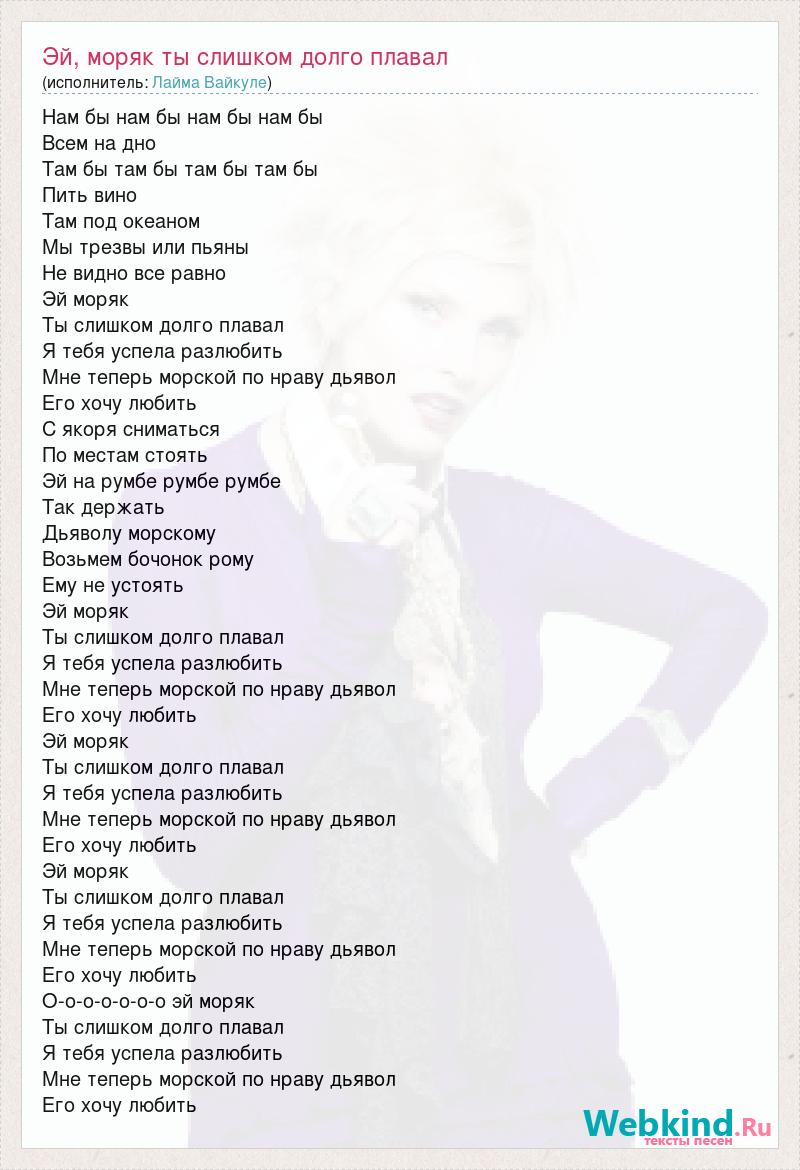 Нам бы нам бы нам бы нам бы Всем на дно Там бы там бы там бы там бы Пить вино Там под океаном Мы трезвы или пьяны Не видно все равно Эй моряк Ты слишком долго плавал Я тебя успела разлюбить Мне теперь морской по нраву дьявол Его хочу любить С якоря сниматься По местам стоять Эй на румбе румбе румбе Так держать Дьяволу морскому Возьмем бочонок рому Ему не устоять Эй моряк Ты слишком долго плавал Я тебя успела разлюбить Мне теперь морской по нраву дьявол Его хочу любить Эй моряк Ты слишком долго плавал Я тебя успела разлюбить Мне теперь морской по нраву дьявол Его хочу любить Эй моряк Ты слишком долго плавал Я тебя успела разлюбить Мне теперь морской по нраву дьявол Его хочу любить О-о-о-о-о-о-о эй моряк Ты слишком долго плавал Я тебя успела разлюбить Мне теперь морской по нраву дьявол Его хочу любить
