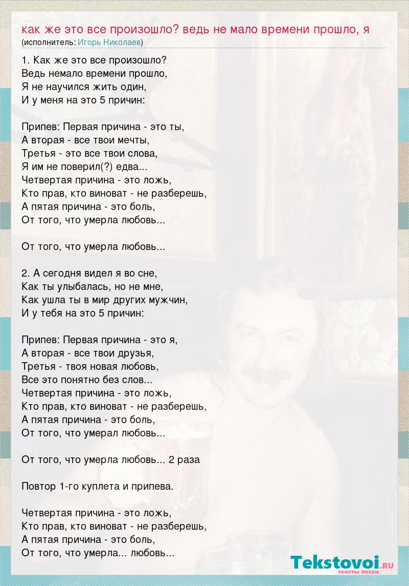 1. Как же это все произошло? Ведь немало времени прошло, Я не научился жить один, И у меня на это 5 причин: Припев: Первая причина - это ты, А вторая - все твои мечты, Третья - это все твои слова, Я им не поверил(?) едва... Четвертая причина - это ложь, Кто прав, кто виноват - не разберешь, А пятая причина - это боль, От того, что умерла любовь... От того, что умерла любовь... 2. А сегодня видел я во сне, Как ты улыбалась, но не мне, Как ушла ты в мир других мужчин, И у тебя на это 5 причин: Припев: Первая причина - это я, А вторая - все твои друзья, Третья - твоя новая любовь, Все это понятно без слов... Четвертая причина - это ложь, Кто прав, кто виноват - не разберешь, А пятая причина - это боль, От того, что умерал любовь... От того, что умерла любовь... 2 раза Повтор 1-го куплета и припева. Четвертая причина - это ложь, Кто прав, кто виноват - не разберешь, А пятая причина - это боль, От того, что умерла... любовь...