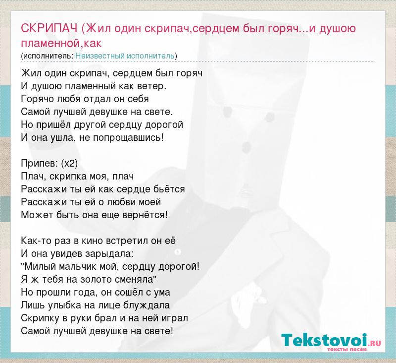 Главная→Исполнители→Неизвестный Исполнитель→СКРИПАЧ (Жил один скрипач,сердцем был горяч...и душою пламенной,как ветер..Горяч