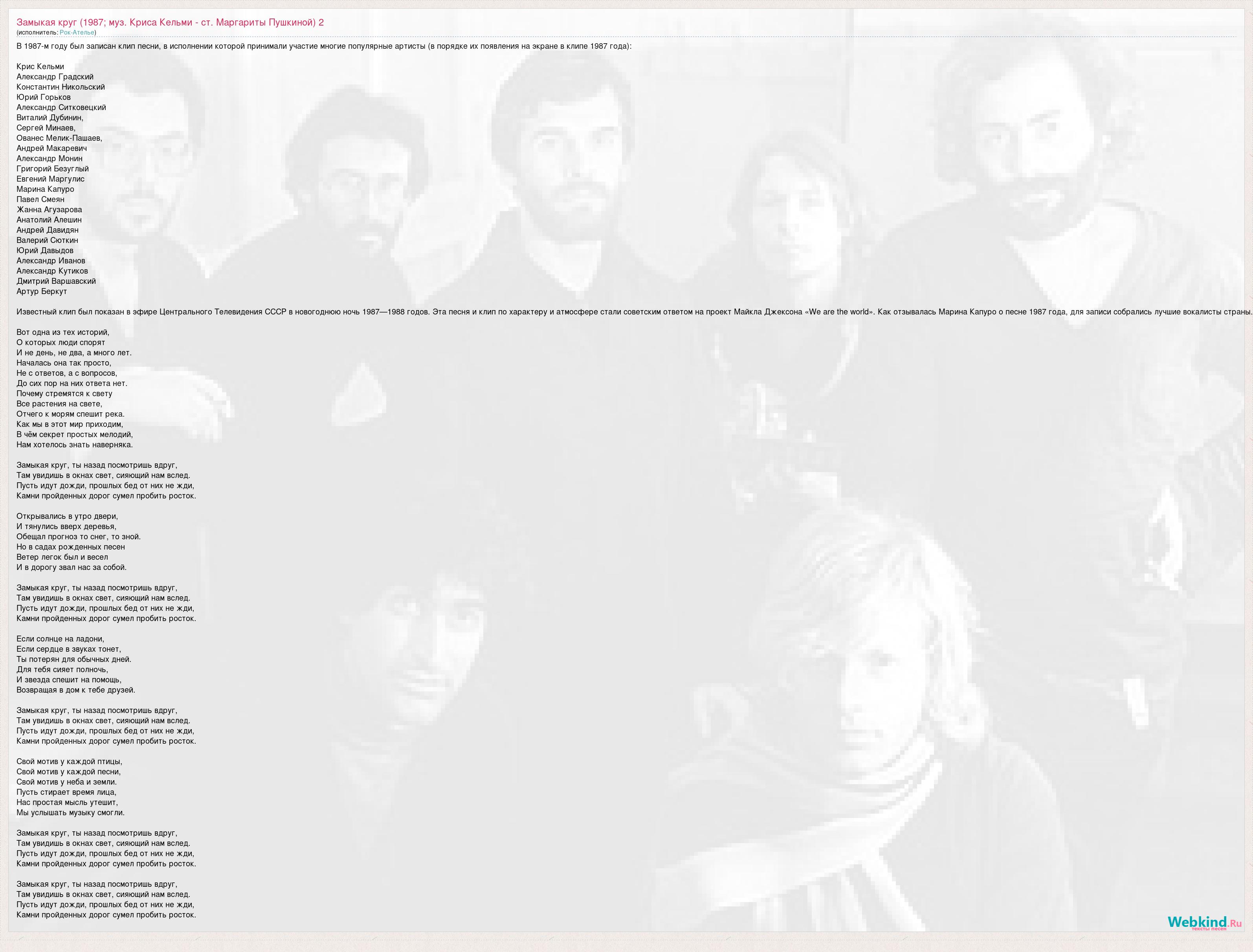 В 1987-м году был записан клип песни, в исполнении которой принимали участие многие популярные артисты (в порядке их появления на экране в клипе 1987 года): Крис Кельми Александр Градский Константин Никольский Юрий Горьков Александр Ситковецкий Виталий Дубинин, Сергей Минаев, Ованес Мелик-Пашаев, Андрей Макаревич Александр Монин Григорий Безуглый Евгений Маргулис Марина Капуро Павел Смеян Жанна Агузарова Анатолий Алешин Андрей Давидян Валерий Сюткин Юрий Давыдов Александр Иванов Александр Кутиков Дмитрий Варшавский Артур Беркут Известный клип был показан в эфире Центрального Телевидения СССР в новогоднюю ночь 1987—1988 годов. Эта песня и клип по характеру и атмосфере стали советским ответом на проект Майкла Джексона «We are the world». Как отзывалась Марина Капуро о песне 1987 года, для записи собрались лучшие вокалисты страны. Вот одна из тех историй, О которых люди спорят И не день, не два, а много лет. Началась она так просто, Не с ответов, а с вопросов, До сих пор на них ответа нет. Почему стремятся к свету Все растения на свете, Отчего к морям спешит река. Как мы в этот мир приходим, В чём секрет простых мелодий, Нам хотелось знать наверняка. Замыкая круг, ты назад посмотришь вдруг, Там увидишь в окнах свет, сияющий нам вслед. Пусть идут дожди, прошлых бед от них не жди, Камни пройденных дорог сумел пробить росток. Открывались в утро двери, И тянулись вверх деревья, Обещал прогноз то снег, то зной. Но в садах рожденных песен Ветер легок был и весел И в дорогу звал нас за собой. Замыкая круг, ты назад посмотришь вдруг, Там увидишь в окнах свет, сияющий нам вслед. Пусть идут дожди, прошлых бед от них не жди, Камни пройденных дорог сумел пробить росток. Если солнце на ладони, Если сердце в звуках тонет, Ты потерян для обычных дней. Для тебя сияет полночь, И звезда спешит на помощь, Возвращая в дом к тебе друзей. Замыкая круг, ты назад посмотришь вдруг, Там увидишь в окнах свет, сияющий нам вслед. Пусть идут дожди, прошлых бед от них не жди, Камни пройденных дорог сумел пробить росток. Свой мотив у каждой птицы, Свой мотив у каждой песни, Свой мотив у неба и земли. Пусть стирает время лица, Нас простая мысль утешит, Мы услышать музыку смогли. Замыкая круг, ты назад посмотришь вдруг, Там увидишь в окнах свет, сияющий нам вслед. Пусть идут дожди, прошлых бед от них не жди, Камни пройденных дорог сумел пробить росток. Замыкая круг, ты назад посмотришь вдруг, Там увидишь в окнах свет, сияющий нам вслед. Пусть идут дожди, прошлых бед от них не жди, Камни пройденных дорог сумел пробить росток.