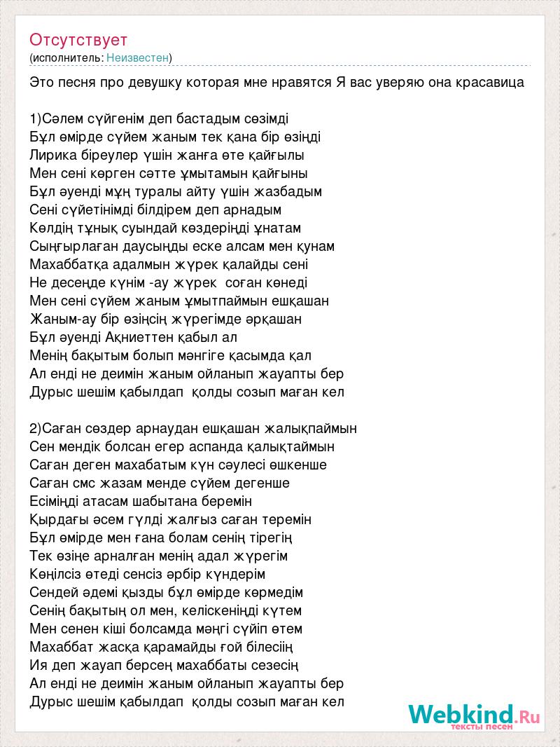 Это песня про девушку которая мне нравятся Я вас уверяю она красавица 1)Сәлем сүйгенім деп бастадым сөзімді Бұл өмірде сүйем жаным тек қана бір өзіңді Лирика біреулер үшін жанға өте қайғылы Мен сені көрген сәтте ұмытамын қайғыны Бұл әуенді мұң туралы айту үшін жазбадым Сені сүйетінімді білдірем деп арнадым Көлдің тұнық суындай көздеріңді ұнатам Сыңғырлаған даусыңды еске алсам мен қунам Махаббатқа адалмын жүрек қалайды сені Не десеңде күнім -ау жүрек соған көнеді Мен сені сүйем жаным ұмытпаймын ешқашан Жаным-ау бір өзіңсің жүрегімде әрқашан Бұл әуенді Ақниеттен қабыл ал Менің бақытым болып мәнгіге қасымда қал Ал енді не деимін жаным ойланып жауапты бер Дурыс шешім қабылдап қолды созып маған кел 2)Саған сөздер арнаудан ешқашан жалықпаймын Сен мендік болсан егер аспанда қалықтаймын Саған деген махабатым күн сәулесі өшкенше Саған смс жазам менде сүйем дегенше Есіміңді атасам шабытана беремін Қырдағы әсем гүлді жалғыз саған теремін Бұл өмірде мен ғана болам сенің тірегің Тек өзіңе арналған менің адал жүрегім Көңілсіз өтеді сенсіз әрбір күндерім Сендей әдемі қызды бұл өмірде көрмедім Сенің бақытың ол мен, келіскеніңді күтем Мен сенен кіші болсамда мәңгі сүйіп өтем Махаббат жасқа қарамайды ғой білесіің Ия деп жауап берсең махаббаты сезесің Ал енді не деимін жаным ойланып жауапты бер Дурыс шешім қабылдап қолды созып маған кел