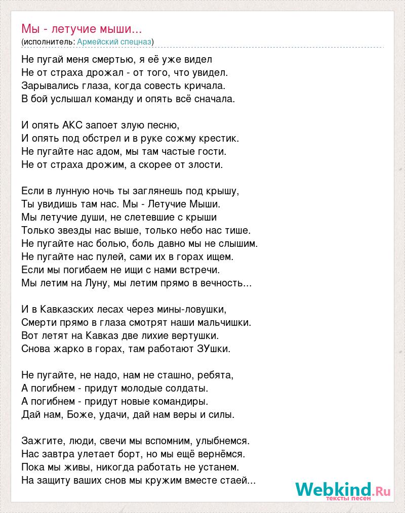 Не пугай меня смертью, я её уже видел Не от страха дрожал - от того, что увидел. Зарывались глаза, когда совесть кричала. В бой услышал команду и опять всё сначала. И опять АКС запоет злую песню, И опять под обстрел и в руке сожму крестик. Не пугайте нас адом, мы там частые гости. Не от страха дрожим, а скорее от злости. Если в лунную ночь ты заглянешь под крышу, Ты увидишь там нас. Мы - Летучие Мыши. Мы летучие души, не слетевшие с крыши Только звезды нас выше, только небо нас тише. Не пугайте нас болью, боль давно мы не слышим. Не пугайте нас пулей, сами их в горах ищем. Если мы погибаем не ищи с нами встречи. Мы летим на Луну, мы летим прямо в вечность... И в Кавказских лесах через мины-ловушки, Смерти прямо в глаза смотрят наши мальчишки. Вот летят на Кавказ две лихие вертушки. Снова жарко в горах, там работают ЗУшки. Не пугайте, не надо, нам не сташно, ребята, А погибнем - придут молодые солдаты. А погибнем - придут новые командиры. Дай нам, Боже, удачи, дай нам веры и силы. Зажгите, люди, свечи мы вспомним, улыбнемся. Нас завтра улетает борт, но мы ещё вернёмся. Пока мы живы, никогда работать не устанем. На защиту ваших снов мы кружим вместе стаей...