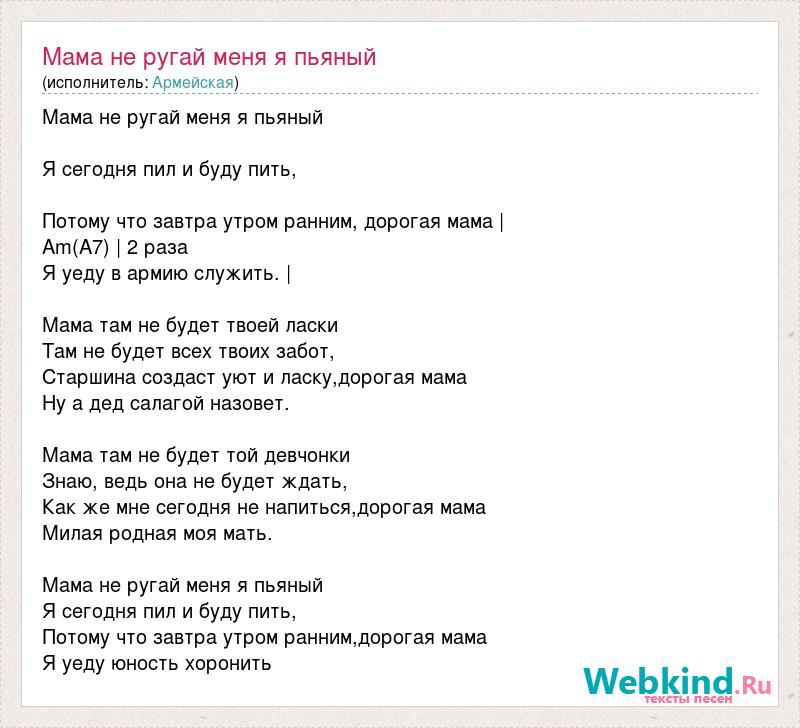 Мама не ругай меня я пьяный Я сегодня пил и буду пить, Потому что завтра утром ранним, дорогая мама | Am(A7) | 2 раза Я уеду в армию служить. | Мама там не будет твоей ласки Там не будет всех твоих забот, Старшина создаст уют и ласку,дорогая мама Ну а дед салагой назовет. Мама там не будет той девчонки Знаю, ведь она не будет ждать, Как же мне сегодня не напиться,дорогая мама Милая родная моя мать. Мама не ругай меня я пьяный Я сегодня пил и буду пить, Потому что завтра утром ранним,дорогая мама Я уеду юность хоронить