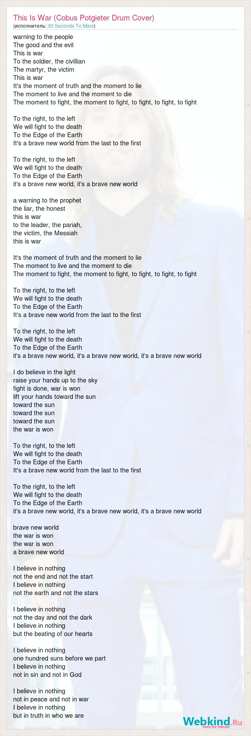 warning to the people The good and the evil This is war To the soldier, the civillian The martyr, the victim This is war It's the moment of truth and the moment to lie The moment to live and the moment to die The moment to fight, the moment to fight, to fight, to fight, to fight To the right, to the left We will fight to the death To the Edge of the Earth It's a brave new world from the last to the first To the right, to the left We will fight to the death To the Edge of the Earth it's a brave new world, it's a brave new world a warning to the prophet the liar, the honest this is war to the leader, the pariah, the victim, the Messiah this is war It's the moment of truth and the moment to lie The moment to live and the moment to die The moment to fight, the moment to fight, to fight, to fight, to fight To the right, to the left We will fight to the death To the Edge of the Earth It's a brave new world from the last to the first To the right, to the left We will fight to the death To the Edge of the Earth it's a brave new world, it's a brave new world, it's a brave new world I do believe in the light raise your hands up to the sky fight is done, war is won lift your hands toward the sun toward the sun toward the sun toward the sun the war is won To the right, to the left We will fight to the death To the Edge of the Earth It's a brave new world from the last to the first To the right, to the left We will fight to the death To the Edge of the Earth it's a brave new world, it's a brave new world, it's a brave new world brave new world the war is won the war is won a brave new world I believe in nothing not the end and not the start I believe in nothing not the earth and not the stars I believe in nothing not the day and not the dark I believe in nothing but the beating of our hearts I believe in nothing one hundred suns before we part I believe in nothing not in sin and not in God I believe in nothing not in peace and not in war I believe in nothing but in truth in who we are