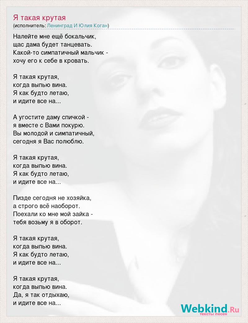 Налейте мне ещё бокальчик, щас дама будет танцевать. Какой-то симпатичный мальчик - хочу его к себе в кровать. Я такая крутая, когда выпью вина. Я как будто летаю, и идите все на... А угостите даму спичкой - я вместе с Вами покурю. Вы молодой и симпатичный, сегодня я Вас полюблю. Я такая крутая, когда выпью вина. Я как будто летаю, и идите все на... Пизде сегодня не хозяйка, а строго всё наоборот. Поехали ко мне мой зайка - тебя возьму я в оборот. Я такая крутая, когда выпью вина. Я как будто летаю, и идите все на... Я такая крутая, когда выпью вина. Да, я так отдыхаю, и идите все на...