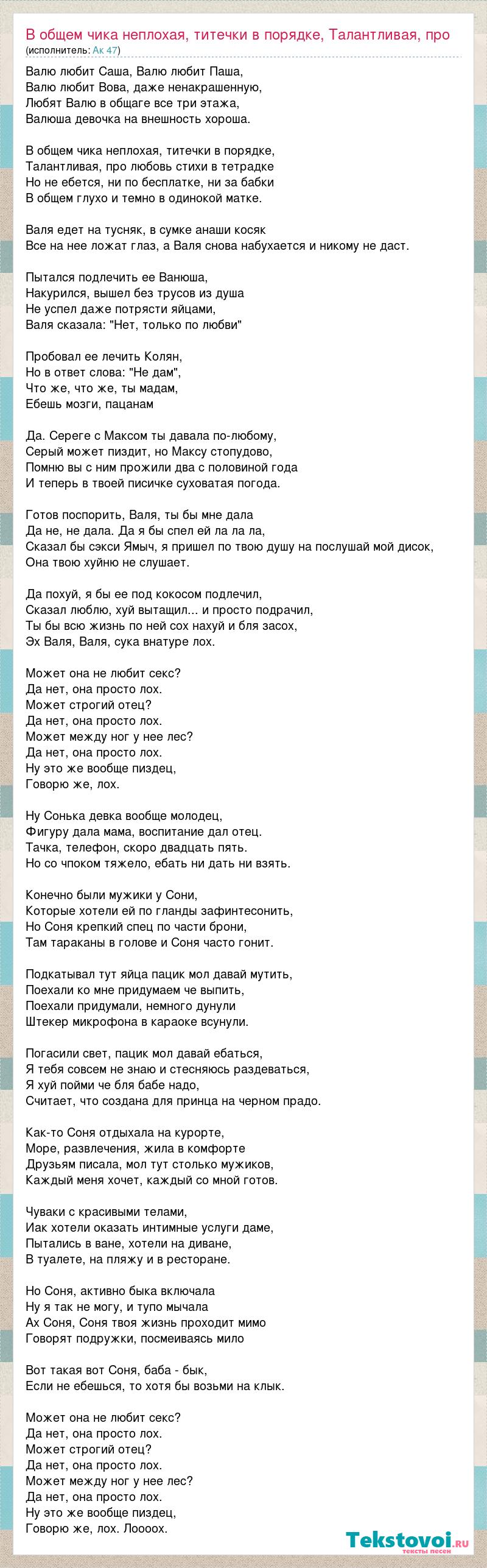 Валю любит Саша, Валю любит Паша, Валю любит Вова, даже ненакрашенную, Любят Валю в общаге все три этажа, Валюша девочка на внешность хороша. В общем чика неплохая, титечки в порядке, Талантливая, про любовь стихи в тетрадке Но не ебется, ни по бесплатке, ни за бабки В общем глухо и темно в одинокой матке. Валя едет на тусняк, в сумке анаши косяк Все на нее ложат глаз, а Валя снова набухается и никому не даст. Пытался подлечить ее Ванюша, Накурился, вышел без трусов из душа Не успел даже потрясти яйцами, Валя сказала: "Нет, только по любви" Пробовал ее лечить Колян, Но в ответ слова: "Не дам", Что же, что же, ты мадам, Ебешь мозги, пацанам Да. Сереге с Максом ты давала по-любому, Серый может пиздит, но Максу стопудово, Помню вы с ним прожили два с половиной года И теперь в твоей писичке суховатая погода. Готов поспорить, Валя, ты бы мне дала Да не, не дала. Да я бы спел ей ла ла ла, Сказал бы сэкси Ямыч, я пришел по твою душу на послушай мой дисок, Она твою хуйню не слушает. Да похуй, я бы ее под кокосом подлечил, Сказал люблю, хуй вытащил... и просто подрачил, Ты бы всю жизнь по ней сох нахуй и бля засох, Эх Валя, Валя, сука внатуре лох. Может она не любит секс? Да нет, она просто лох. Может строгий отец? Да нет, она просто лох. Может между ног у нее лес? Да нет, она просто лох. Ну это же вообще пиздец, Говорю же, лох. Ну Сонька девка вообще молодец, Фигуру дала мама, воспитание дал отец. Тачка, телефон, скоро двадцать пять. Но со чпоком тяжело, ебать ни дать ни взять. Конечно были мужики у Сони, Которые хотели ей по гланды зафинтесонить, Но Соня крепкий спец по части брони, Там тараканы в голове и Соня часто гонит. Подкатывал тут яйца пацик мол давай мутить, Поехали ко мне придумаем че выпить, Поехали придумали, немного дунули Штекер микрофона в караоке всунули. Погасили свет, пацик мол давай ебаться, Я тебя совсем не знаю и стесняюсь раздеваться, Я хуй пойми че бля бабе надо, Считает, что создана для принца на черном прадо. Как-то Соня отдыхала на курорте, Море, развлечения, жила в комфорте Друзьям писала, мол тут столько мужиков, Каждый меня хочет, каждый со мной готов. Чуваки с красивыми телами, Иак хотели оказать интимные услуги даме, Пытались в ване, хотели на диване, В туалете, на пляжу и в ресторане. Но Соня, активно быка включала Ну я так не могу, и тупо мычала Ах Соня, Соня твоя жизнь проходит мимо Говорят подружки, посмеиваясь мило Вот такая вот Соня, баба - бык, Если не ебешься, то хотя бы возьми на клык. Может она не любит секс? Да нет, она просто лох. Может строгий отец? Да нет, она просто лох. Может между ног у нее лес? Да нет, она просто лох. Ну это же вообще пиздец, Говорю же, лох. Лоооох.