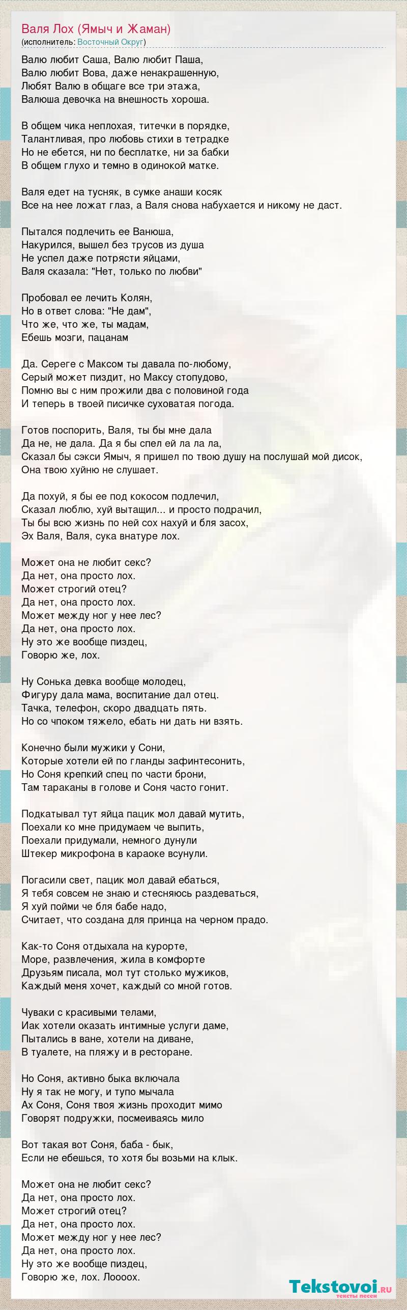 Валю любит Саша, Валю любит Паша, Валю любит Вова, даже ненакрашенную, Любят Валю в общаге все три этажа, Валюша девочка на внешность хороша. В общем чика неплохая, титечки в порядке, Талантливая, про любовь стихи в тетрадке Но не ебется, ни по бесплатке, ни за бабки В общем глухо и темно в одинокой матке. Валя едет на тусняк, в сумке анаши косяк Все на нее ложат глаз, а Валя снова набухается и никому не даст. Пытался подлечить ее Ванюша, Накурился, вышел без трусов из душа Не успел даже потрясти яйцами, Валя сказала: "Нет, только по любви" Пробовал ее лечить Колян, Но в ответ слова: "Не дам", Что же, что же, ты мадам, Ебешь мозги, пацанам Да. Сереге с Максом ты давала по-любому, Серый может пиздит, но Максу стопудово, Помню вы с ним прожили два с половиной года И теперь в твоей писичке суховатая погода. Готов поспорить, Валя, ты бы мне дала Да не, не дала. Да я бы спел ей ла ла ла, Сказал бы сэкси Ямыч, я пришел по твою душу на послушай мой дисок, Она твою хуйню не слушает. Да похуй, я бы ее под кокосом подлечил, Сказал люблю, хуй вытащил... и просто подрачил, Ты бы всю жизнь по ней сох нахуй и бля засох, Эх Валя, Валя, сука внатуре лох. Может она не любит секс? Да нет, она просто лох. Может строгий отец? Да нет, она просто лох. Может между ног у нее лес? Да нет, она просто лох. Ну это же вообще пиздец, Говорю же, лох. Ну Сонька девка вообще молодец, Фигуру дала мама, воспитание дал отец. Тачка, телефон, скоро двадцать пять. Но со чпоком тяжело, ебать ни дать ни взять. Конечно были мужики у Сони, Которые хотели ей по гланды зафинтесонить, Но Соня крепкий спец по части брони, Там тараканы в голове и Соня часто гонит. Подкатывал тут яйца пацик мол давай мутить, Поехали ко мне придумаем че выпить, Поехали придумали, немного дунули Штекер микрофона в караоке всунули. Погасили свет, пацик мол давай ебаться, Я тебя совсем не знаю и стесняюсь раздеваться, Я хуй пойми че бля бабе надо, Считает, что создана для принца на черном прадо. Как-то Соня отдыхала на курорте, Море, развлечения, жила в комфорте Друзьям писала, мол тут столько мужиков, Каждый меня хочет, каждый со мной готов. Чуваки с красивыми телами, Иак хотели оказать интимные услуги даме, Пытались в ване, хотели на диване, В туалете, на пляжу и в ресторане. Но Соня, активно быка включала Ну я так не могу, и тупо мычала Ах Соня, Соня твоя жизнь проходит мимо Говорят подружки, посмеиваясь мило Вот такая вот Соня, баба - бык, Если не ебешься, то хотя бы возьми на клык. Может она не любит секс? Да нет, она просто лох. Может строгий отец? Да нет, она просто лох. Может между ног у нее лес? Да нет, она просто лох. Ну это же вообще пиздец, Говорю же, лох. Лоооох.
