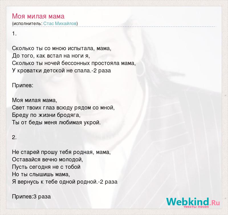 1. Сколько ты со мною испытала, мама, До того, как встал на ноги я, Сколько ты ночей бессонных простояла мама, У кроватки детской не спала.-2 раза Припев: Моя милая мама, Свет твоих глаз всюду рядом со мной, Бреду по жизни бродяга, Ты от беды меня любимая укрой. 2. Не старей прошу тебя родная, мама, Оставайся вечно молодой, Пусть сегодня не с тобой Но ты слышишь мама, Я вернусь к тебе одной родной.-2 раза Припев:3 раза