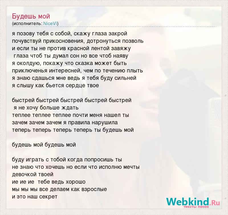 я позову тебя с собой, скажу глаза закрой почувствуй прикосновения, дотронуться позволь и если ты не против красной лентой завяжу глаза чтоб ты думал сон но все чтоб наяву я околдую, покажу что сказка может быть приключенья интересней, чем по течению плыть я знаю сдашься мне ведь я тебя буду сильней я слышу как бьется сердце твое быстрей быстрей быстрей быстрей быстрей я не хочу больше ждать теплее теплее теплее почти меня нашел ты зачем зачем зачем я правила нарушила теперь теперь теперь теперь ты будешь мой будешь мой будешь мой буду играть с тобой когда попросишь ты не знаю что хочешь но если что исполню мечты девочкой твоей ие ие ие тебе ведь хорошо мы мы мы все делаем как взрослые и это наш секрет