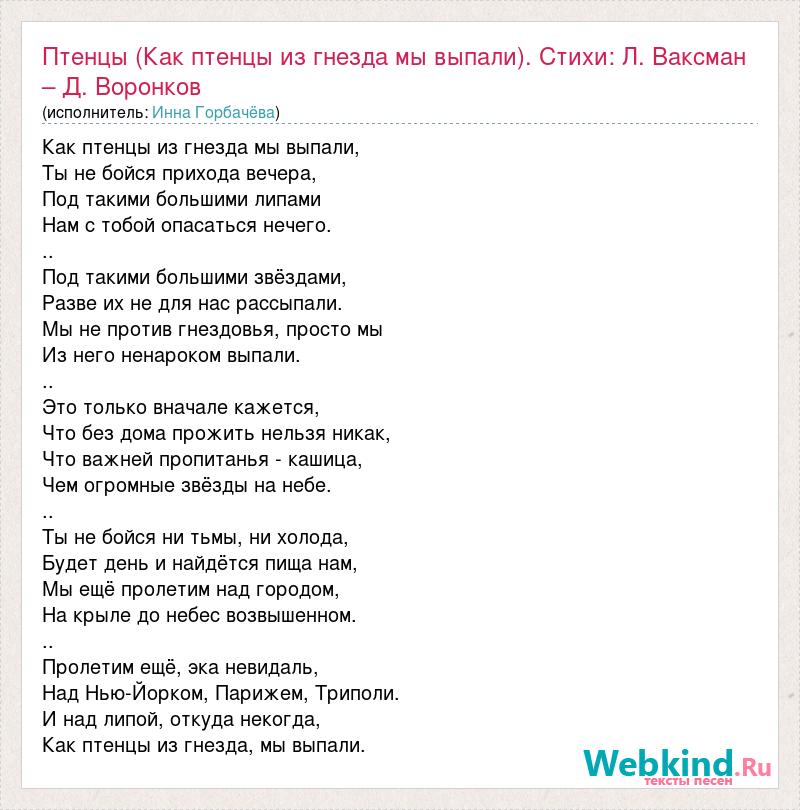 Главная→Исполнители→Инна Горбачёва→Птенцы (Как птенцы из гнезда мы выпали). Стихи: Л. Ваксман – Д. Воронко