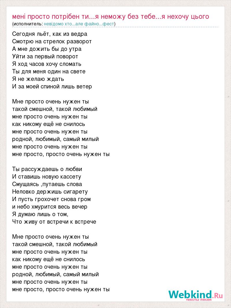 Сегодня льёт, как из ведра Смотрю на стрелок разворот А мне дожить бы до утра Уйти за первый поворот Я ход часов хочу сломать Ты для меня один на свете Я не желаю ждать И за моей спиной лишь ветер Мне просто очень нужен ты такой смешной, такой любимый мне просто очень нужен ты как никому ещё не снилось мне просто очень нужен ты родной, любимый, самый милый мне просто очень нужен ты мне просто, просто очень нужен ты Ты рассуждаешь о любви И ставишь новую кассету Смущаясь ,путаешь слова Неловко держишь сигарету И пусть грохочет снова гром и небо хмурится весь вечер Я думаю лишь о том, Что живу от встречи к встрече Мне просто очень нужен ты такой смешной, такой любимый мне просто очень нужен ты как никому ещё не снилось мне просто очень нужен ты родной, любимый, самый милый мне просто очень нужен ты мне просто, просто очень нужен ты