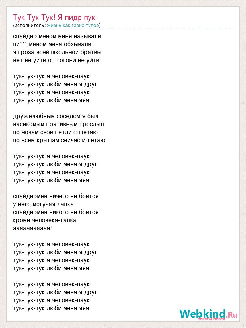 спайдер меном меня называли пи*** меном меня обзывали я гроза всей школьной братвы нет не уйти от погони не уйти тук-тук-тук я человек-паук тук-тук-тук люби меня я друг тук-тук-тук я человек-паук тук-тук-тук люби меня яяя дружелюбным соседом я был насекомым пративным прослыл по ночам свои петли сплетаю по всем крышам сейчас и летаю тук-тук-тук я человек-паук тук-тук-тук люби меня я друг тук-тук-тук я человек-паук тук-тук-тук люби меня яяя спайдермен ничего не боится у него могучая лапка спайдермен никого не боится кроме человека-тапка ааааааааааа! тук-тук-тук я человек-паук тук-тук-тук люби меня я друг тук-тук-тук я человек-паук тук-тук-тук люби меня яяя тук-тук-тук я человек-паук тук-тук-тук люби меня я друг тук-тук-тук я человек-паук тук-тук-тук люби меня яяя