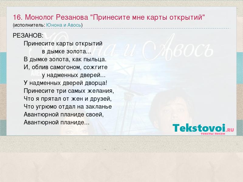 А как ты думаешь, о чем песня "16. Монолог Резанова "Принесите мне карты открытий"" ?