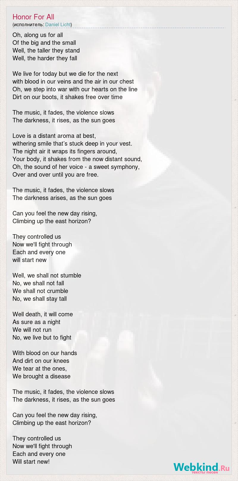 Oh, along us for all Of the big and the small Well, the taller they stand Well, the harder they fall We live for today but we die for the next with blood in our veins and the air in our chest Oh, we step into war with our hearts on the line Dirt on our boots, it shakes free over time The music, it fades, the violence slows The darkness, it rises, as the sun goes Love is a distant aroma at best, withering smile that’s stuck deep in your vest. The night air it wraps its fingers around, Your body, it shakes from the now distant sound, Oh, the sound of her voice - a sweet symphony, Over and over until you are free. The music, it fades, the violence slows The darkness arises, as the sun goes Can you feel the new day rising, Climbing up the east horizon? They controlled us Now we'll fight through Each and every one will start new Well, we shall not stumble No, we shall not fall We shall not crumble No, we shall stay tall Well death, it will come As sure as a night We will not run No, we live but to fight With blood on our hands And dirt on our knees We tear at the ones, We brought a disease The music, it fades, the violence slows The darkness, it rises, as the sun goes Can you feel the new day rising, Climbing up the east horizon? They controlled us Now we'll fight through Each and every one Will start new!