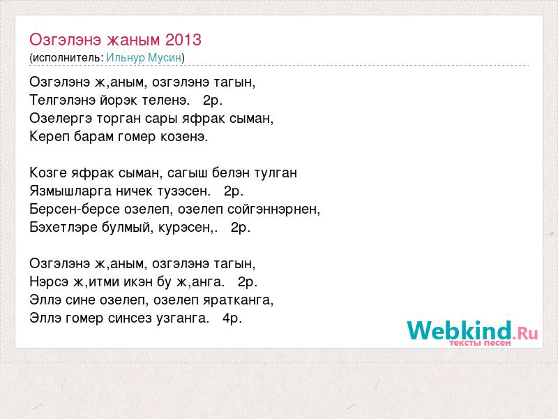 Озгэлэнэ ж,аным, озгэлэнэ тагын, Телгэлэнэ йорэк теленэ. 2р. Озелергэ торган сары яфрак сыман, Кереп барам гомер козенэ. Козге яфрак сыман, сагыш белэн тулган Язмышларга ничек тузэсен. 2р. Берсен-берсе озелеп, озелеп сойгэннэрнен, Бэхетлэре булмый, курэсен,. 2р. Озгэлэнэ ж,аным, озгэлэнэ тагын, Нэрсэ ж,итми икэн бу ж,анга. 2р. Эллэ сине озелеп, озелеп яратканга, Эллэ гомер синсез узганга. 4р.