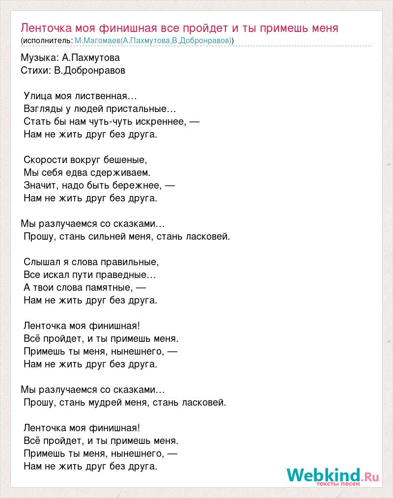 Музыка: А.Пахмутова Стихи: В.Добронравов Улица моя лиственная… Взгляды у людей пристальные… Стать бы нам чуть-чуть искреннее, — Нам не жить друг без друга. Скорости вокруг бешеные, Мы себя едва сдерживаем. Значит, надо быть бережнее, — Нам не жить друг без друга. Мы разлучаемся со сказками… Прошу, стань сильней меня, стань ласковей. Слышал я слова правильные, Все искал пути праведные… А твои слова памятные, — Нам не жить друг без друга. Ленточка моя финишная! Всё пройдет, и ты примешь меня. Примешь ты меня, нынешнего, — Нам не жить друг без друга. Мы разлучаемся со сказками… Прошу, стань мудрей меня, стань ласковей. Ленточка моя финишная! Всё пройдет, и ты примешь меня. Примешь ты меня, нынешнего, — Нам не жить друг без друга.