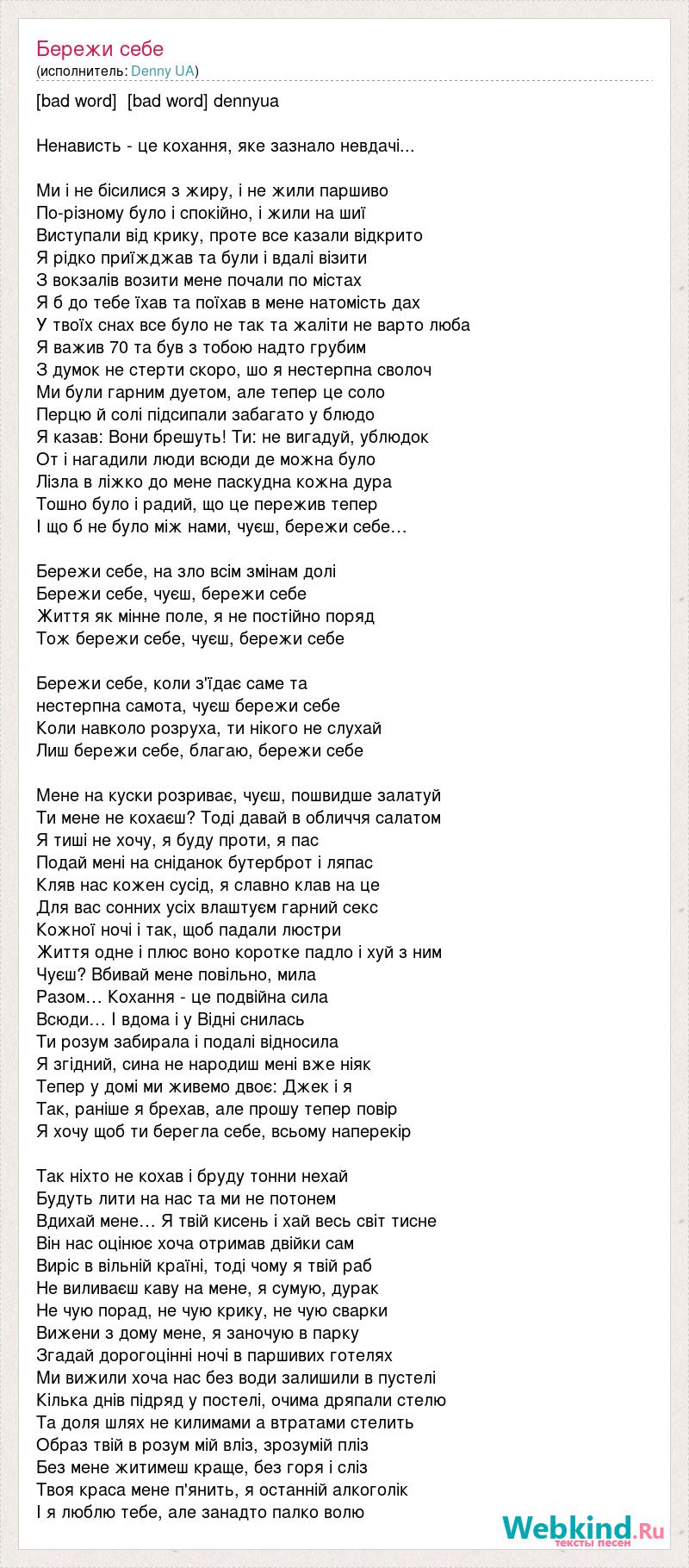 [bad word] [bad word] dennyua Ненависть - це кохання, яке зазнало невдачі... Ми і не бісилися з жиру, і не жили паршиво По-різному було і спокійно, і жили на шиї Виступали від крику, проте все казали відкрито Я рідко приїжджав та були і вдалі візити З вокзалів возити мене почали по містах Я б до тебе їхав та поїхав в мене натомість дах У твоїх снах все було не так та жаліти не варто люба Я важив 70 та був з тобою надто грубим З думок не стерти скоро, шо я нестерпна сволоч Ми були гарним дуетом, але тепер це соло Перцю й солі підсипали забагато у блюдо Я казав: Вони брешуть! Ти: не вигадуй, ублюдок От і нагадили люди всюди де можна було Лізла в ліжко до мене паскудна кожна дура Тошно було і радий, що це пережив тепер І що б не було між нами, чуєш, бережи себе… Бережи себе, на зло всім змінам долі Бережи себе, чуєш, бережи себе Життя як мінне поле, я не постійно поряд Тож бережи себе, чуєш, бережи себе Бережи себе, коли з'їдає саме та нестерпна самота, чуєш бережи себе Коли навколо розруха, ти нікого не слухай Лиш бережи себе, благаю, бережи себе Мене на куски розриває, чуєш, пошвидше залатуй Ти мене не кохаєш? Тоді давай в обличчя салатом Я тиші не хочу, я буду проти, я пас Подай мені на сніданок бутерброт і ляпас Кляв нас кожен сусід, я славно клав на це Для вас сонних усіх влаштуєм гарний секс Кожної ночі і так, щоб падали люстри Життя одне і плюс воно коротке падло і хуй з ним Чуєш? Вбивай мене повільно, мила Разом… Кохання - це подвійна сила Всюди… І вдома і у Відні снилась Ти розум забирала і подалі відносила Я згідний, сина не народиш мені вже ніяк Тепер у домі ми живемо двоє: Джек і я Так, раніше я брехав, але прошу тепер повір Я хочу щоб ти берегла себе, всьому наперекір Так ніхто не кохав і бруду тонни нехай Будуть лити на нас та ми не потонем Вдихай мене… Я твій кисень і хай весь світ тисне Він нас оцінює хоча отримав двійки сам Виріс в вільній країні, тоді чому я твій раб Не виливаєш каву на мене, я сумую, дурак Не чую порад, не чую крику, не чую сварки Вижени з дому мене, я заночую в парку Згадай дорогоцінні ночі в паршивих готелях Ми вижили хоча нас без води залишили в пустелі Кілька днів підряд у постелі, очима дряпали стелю Та доля шлях не килимами а втратами стелить Образ твій в розум мій вліз, зрозумій пліз Без мене житимеш краще, без горя і сліз Твоя краса мене п'янить, я останній алкоголік І я люблю тебе, але занадто палко волю