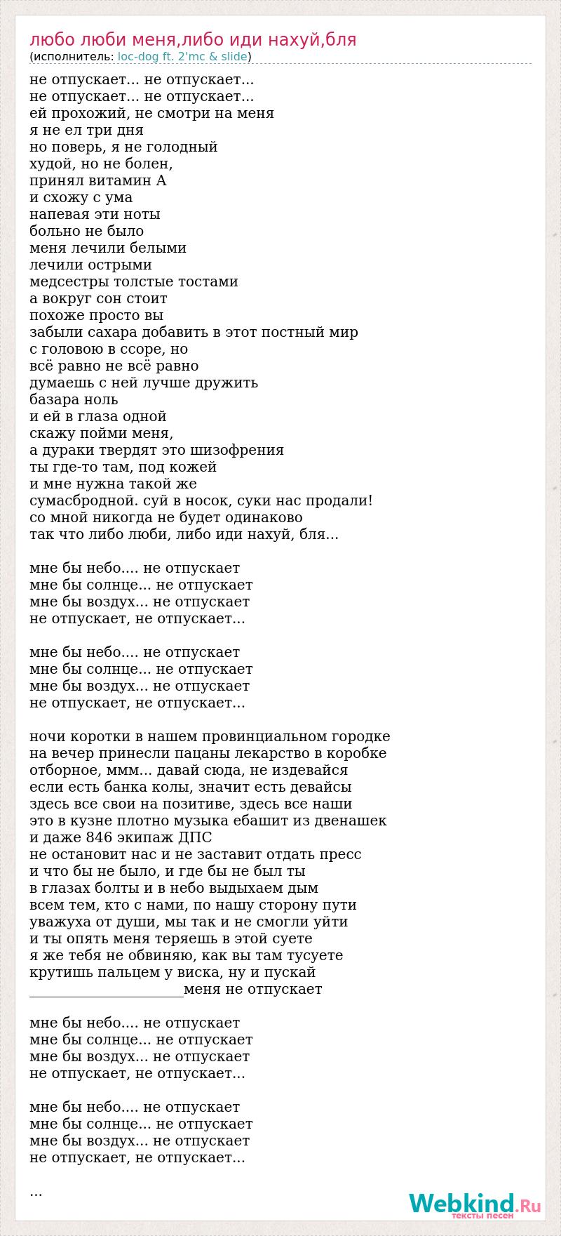 не отпускает... не отпускает... не отпускает... не отпускает... ей прохожий, не смотри на меня я не ел три дня но поверь, я не голодный худой, но не болен, принял витамин А и схожу с ума напевая эти ноты больно не было меня лечили белыми лечили острыми медсестры толстые тостами а вокруг сон стоит похоже просто вы забыли сахара добавить в этот постный мир с головою в ссоре, но всё равно не всё равно думаешь с ней лучше дружить базара ноль и ей в глаза одной скажу пойми меня, а дураки твердят это шизофрения ты где-то там, под кожей и мне нужна такой же сумасбродной. суй в носок, суки нас продали! со мной никогда не будет одинаково так что либо люби, либо иди нахуй, бля... мне бы небо.... не отпускает мне бы солнце... не отпускает мне бы воздух... не отпускает не отпускает, не отпускает... мне бы небо.... не отпускает мне бы солнце... не отпускает мне бы воздух... не отпускает не отпускает, не отпускает... ночи коротки в нашем провинциальном городке на вечер принесли пацаны лекарство в коробке отборное, ммм... давай сюда, не издевайся если есть банка колы, значит есть девайсы здесь все свои на позитиве, здесь все наши это в кузне плотно музыка ебашит из двенашек и даже 846 экипаж ДПС не остановит нас и не заставит отдать пресс и что бы не было, и где бы не был ты в глазах болты и в небо выдыхаем дым всем тем, кто с нами, по нашу сторону пути уважуха от души, мы так и не смогли уйти и ты опять меня теряешь в этой суете я же тебя не обвиняю, как вы там тусуете крутишь пальцем у виска, ну и пускай ______________________меня не отпускает мне бы небо.... не отпускает мне бы солнце... не отпускает мне бы воздух... не отпускает не отпускает, не отпускает... мне бы небо.... не отпускает мне бы солнце... не отпускает мне бы воздух... не отпускает не отпускает, не отпускает... ...