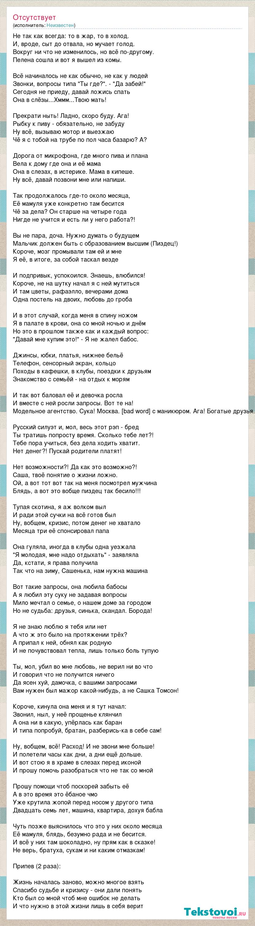 Не так как всегда: то в жар, то в холод. И, вроде, сыт до отвала, но мучает голод. Вокруг ни что не изменилось, но всё по-другому. Пелена сошла и вот я вышел из комы. Всё начиналось не как обычно, не как у людей Звонки, вопросы типа "Ты где?". - "Да забей!" Сегодня не приеду, давай ложись спать Она в слёзы...Хммм...Твою мать! Прекрати ныть! Ладно, скоро буду. Ага! Рыбку к пиву - обязательно, не забуду Ну всё, вызываю мотор и выезжаю Чё я с тобой на трубе по пол часа базарю? А? Дорога от микрофона, где много пива и плана Вела к дому где она и её мама Она в слезах, в истерике. Мама в кипеше. Ну всё, давай позвони мне или напиши. Так продолжалось где-то около месяца, Её мамуля уже конкретно там бесится Чё за дела? Он старше на четыре года Нигде не учится и есть ли у него работа?! Вы не пара, доча. Нужно думать о будущем Мальчик должен быть с образованием высшим (Пиздец!) Короче, мозг промывали там ей и мне Я её, в итоге, за собой таскал везде И подпривык, успокоился. Знаешь, влюбился! Короче, не на шутку начал я с ней мутиться И там цветы, рафаэлло, вечерами дома Одна постель на двоих, любовь до гроба И в этот случай, когда меня в спину ножом Я в палате в крови, она со мной ночью и днём Но это в прошлом также как и каждый вопрос: "Давай мне купим это!" - Я не жалел бабос. Джинсы, юбки, платья, нижнее бельё Телефон, сенсорный экран, кольцо Походы в кафешки, в клубы, поездки к друзьям Знакомство с семьёй - на отдых к морям И так вот баловал её и девочка росла И вместе с ней росли запросы. Вот те на! Модельное агентство. Сука! Москва. [bad word] с маникюром. Ага! Богатые друзья. Русский силуэт и, мол, весь этот рэп - бред Ты тратишь попросту время. Сколько тебе лет?! Тебе пора учиться, без дела ходить хватит. Нет денег?! Пускай родители платят! Нет возможности?! Да как это возможно?! Саша, твоё понятие о жизни ложно. Ой, а вот тот вот так на меня посмотрел мужчина Блядь, а вот это вобще пиздец так бесило!!! Тупая скотина, я аж волком выл И ради этой сучки на всё готов был Ну, вобщем, кризис, потом денег не хватало Месяца три её спонсировал папа Она гуляла, иногда в клубы одна уезжала "Я молодая, мне надо отдыхать" - заявляла Да, кстати, я права получила Так что на зиму, Сашенька, нам нужна машина Вот такие запросы, она любила бабосы А я любил эту суку не задавая вопросы Мило мечтал о семье, о нашем доме за городом Но не судьба: друзья, синька, скандал. Борода! Я не знаю люблю я тебя или нет А что ж это было на протяжении трёх? А припал к ней, обнял как родную И не почувствовал тепла, лишь только боль тупую Ты, мол, убил во мне любовь, не верил ни во что И говорил что не получится ничего Да ясен хуй, дамочка, с вашими запросами Вам нужен был мажор какой-нибудь, а не Сашка Томсон! Короче, кинула она меня и я тут начал: Звонил, ныл, у неё прощенье клянчил А она ни в какую, упёрлась как баран И типа попробуй, братан, разберись-ка в себе сам! Ну, вобщем, всё! Расход! И не звони мне больше! И полетели часы как дни, а дни ещё дольше. И вот стою я в храме в слезах перед иконой И прошу помочь разобраться что не так со мной Прошу помощи чтоб поскорей забыть её А в это время это ёбаное чмо Уже крутила жопой перед носом у другого типа Двадцать семь лет, машина, квартира, дохуя бабла Чуть позже выяснилось что это у них около месяца Её мамуля, блядь, безумно рада и не бесится. И всё у них там шоколадно, ну прям как в сказке! Не верь, братуха, сукам и ни каким отм