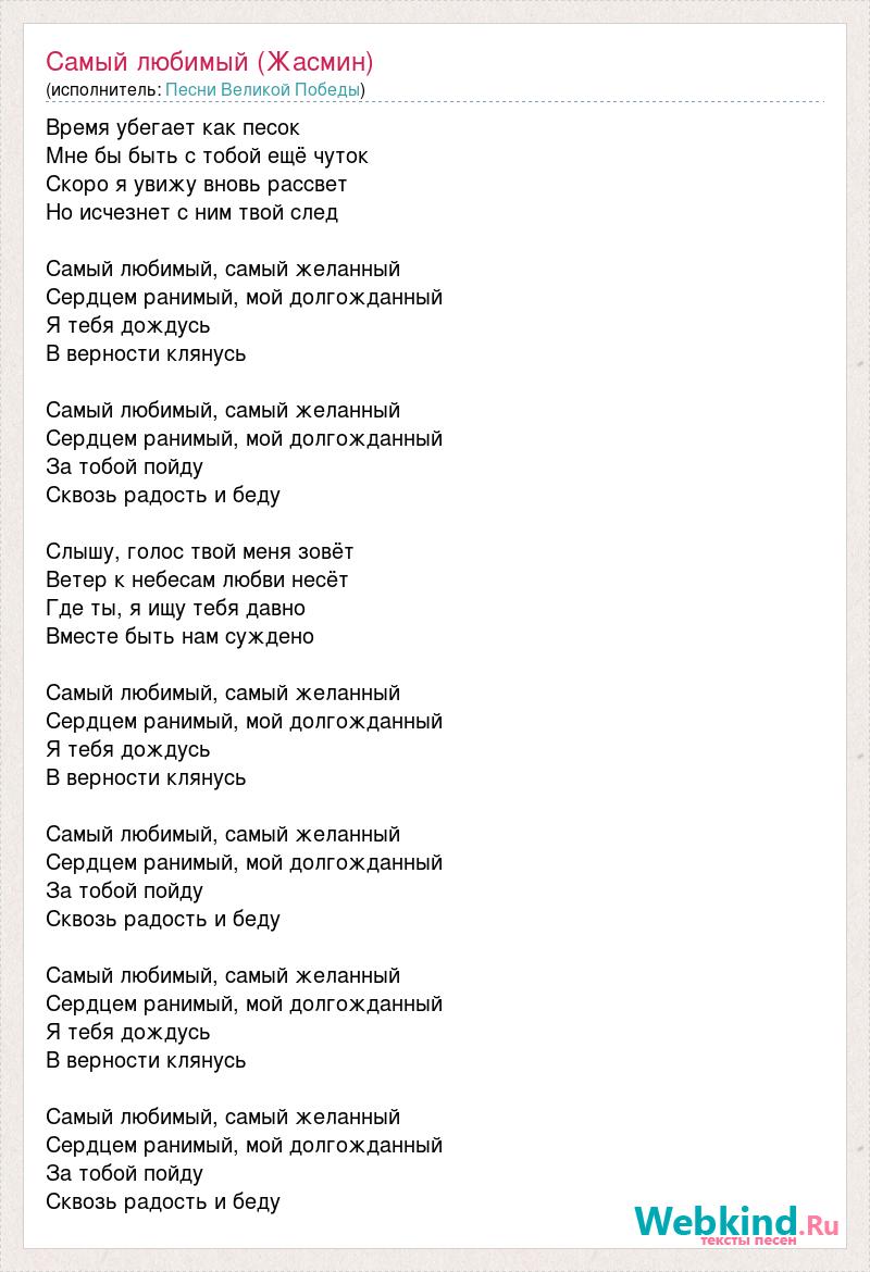 Время убегает как песок Мне бы быть с тобой ещё чуток Скоро я увижу вновь рассвет Но исчезнет с ним твой след Самый любимый, самый желанный Сердцем ранимый, мой долгожданный Я тебя дождусь В верности клянусь Самый любимый, самый желанный Сердцем ранимый, мой долгожданный За тобой пойду Сквозь радость и беду Слышу, голос твой меня зовёт Ветер к небесам любви несёт Где ты, я ищу тебя давно Вместе быть нам суждено Самый любимый, самый желанный Сердцем ранимый, мой долгожданный Я тебя дождусь В верности клянусь Самый любимый, самый желанный Сердцем ранимый, мой долгожданный За тобой пойду Сквозь радость и беду Самый любимый, самый желанный Сердцем ранимый, мой долгожданный Я тебя дождусь В верности клянусь Самый любимый, самый желанный Сердцем ранимый, мой долгожданный За тобой пойду Сквозь радость и беду