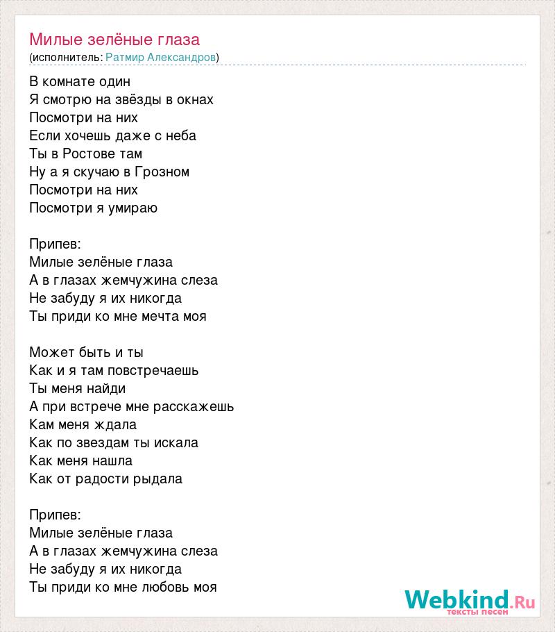 В комнате один Я смотрю на звёзды в окнах Посмотри на них Если хочешь даже с неба Ты в Ростове там Ну а я скучаю в Грозном Посмотри на них Посмотри я умираю Припев: Милые зелёные глаза А в глазах жемчужина слеза Не забуду я их никогда Ты приди ко мне мечта моя Может быть и ты Как и я там повстречаешь Ты меня найди А при встрече мне расскажешь Кам меня ждала Как по звездам ты искала Как меня нашла Как от радости рыдала Припев: Милые зелёные глаза А в глазах жемчужина слеза Не забуду я их никогда Ты приди ко мне любовь моя