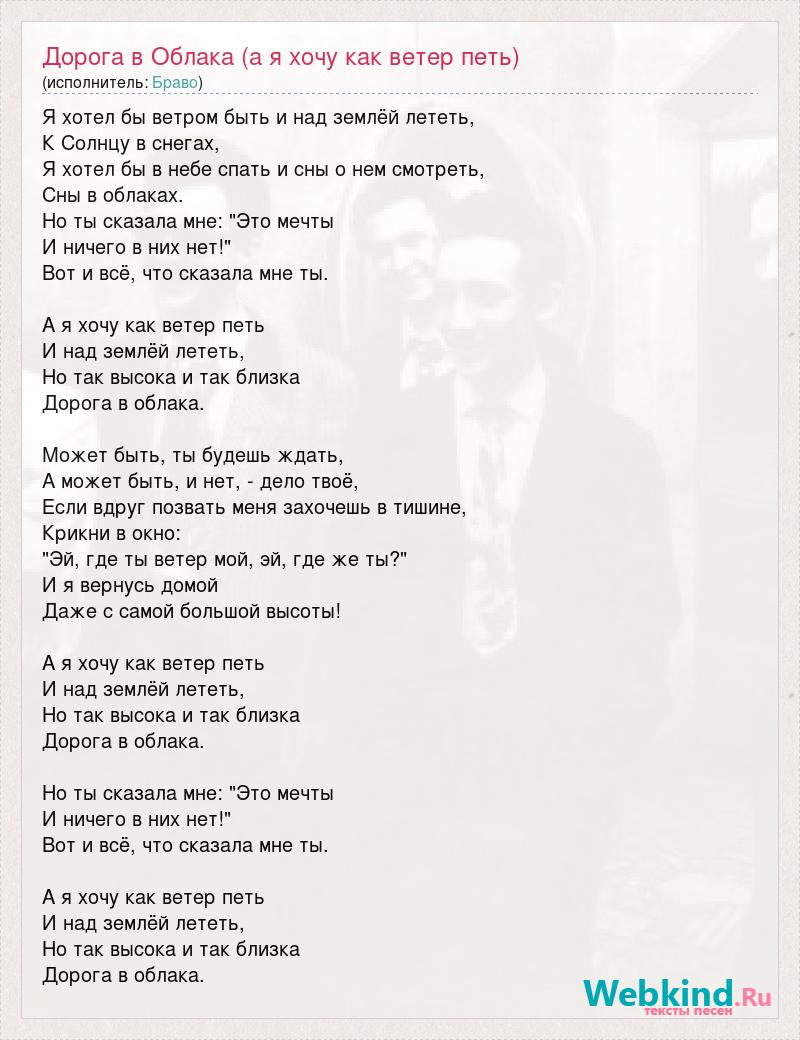 Я хотел бы ветром быть и над землёй лететь, К Солнцу в снегах, Я хотел бы в небе спать и сны о нем смотреть, Сны в облаках. Но ты сказала мне: "Это мечты И ничего в них нет!" Вот и всё, что сказала мне ты. А я хочу как ветер петь И над землёй лететь, Но так высока и так близка Дорога в облака. Может быть, ты будешь ждать, А может быть, и нет, - дело твоё, Если вдруг позвать меня захочешь в тишине, Крикни в окно: "Эй, где ты ветер мой, эй, где же ты?" И я вернусь домой Даже с самой большой высоты! А я хочу как ветер петь И над землёй лететь, Но так высока и так близка Дорога в облака. Но ты сказала мне: "Это мечты И ничего в них нет!" Вот и всё, что сказала мне ты. А я хочу как ветер петь И над землёй лететь, Но так высока и так близка Дорога в облака.