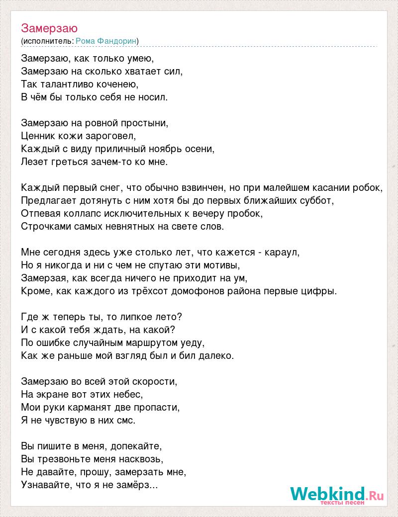 Замерзаю, как только умею, Замерзаю на сколько хватает сил, Так талантливо коченею, В чём бы только себя не носил. Замерзаю на ровной простыни, Ценник кожи зароговел, Каждый с виду приличный ноябрь осени, Лезет греться зачем-то ко мне. Каждый первый снег, что обычно взвинчен, но при малейшем касании робок, Предлагает дотянуть с ним хотя бы до первых ближайших суббот, Отпевая коллапс исключительных к вечеру пробок, Строчками самых невнятных на свете слов. Мне сегодня здесь уже столько лет, что кажется - караул, Но я никогда и ни с чем не спутаю эти мотивы, Замерзая, как всегда ничего не приходит на ум, Кроме, как каждого из трёхсот домофонов района первые цифры. Где ж теперь ты, то липкое лето? И с какой тебя ждать, на какой? По ошибке случайным маршрутом уеду, Как же раньше мой взгляд был и бил далеко. Замерзаю во всей этой скорости, На экране вот этих небес, Мои руки карманят две пропасти, Я не чувствую в них смс. Вы пишите в меня, допекайте, Вы трезвоньте меня насквозь, Не давайте, прошу, замерзать мне, Узнавайте, что я не замёрз...