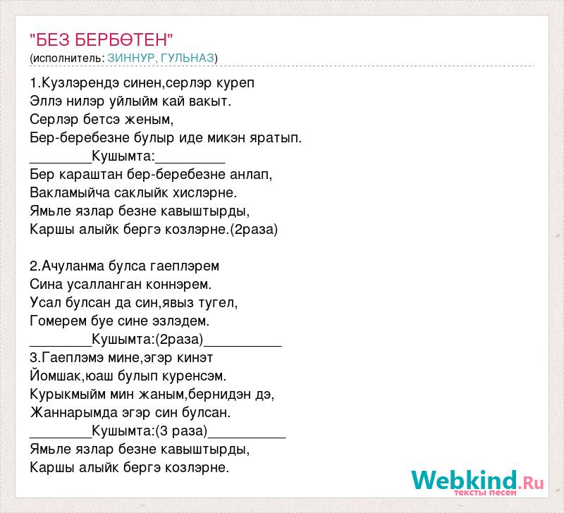 1.Кузлэрендэ синен,серлэр куреп Эллэ нилэр уйлыйм кай вакыт. Серлэр бетсэ женым, Бер-беребезне булыр иде микэн яратып. ________Кушымта:_________ Бер караштан бер-беребезне анлап, Вакламыйча саклыйк хислэрне. Ямьле язлар безне кавыштырды, Каршы алыйк бергэ козлэрне.(2раза) 2.Ачуланма булса гаеплэрем Сина усалланган коннэрем. Усал булсан да син,явыз тугел, Гомерем буе сине эзлэдем. ________Кушымта:(2раза)__________ 3.Гаеплэмэ мине,эгэр кинэт Йомшак,юаш булып куренсэм. Курыкмыйм мин жаным,бернидэн дэ, Жаннарымда эгэр син булсан. ________Кушымта:(3 раза)__________ Ямьле язлар безне кавыштырды, Каршы алыйк бергэ козлэрне.