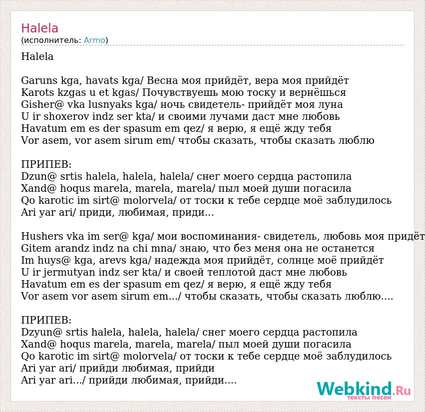 Halela Garuns kga, havats kga/ Весна моя прийдёт, вера моя прийдёт Karots kzgas u et kgas/ Почувствуешь мою тоску и вернёшься Gisher@ vka lusnyaks kga/ ночь свидетель- прийдёт моя луна U ir shoxerov indz ser kta/ и своими лучами даст мне любовь Havatum em es der spasum em qez/ я верю, я ещё жду тебя Vor asem, vor asem sirum em/ чтобы сказать, чтобы сказать люблю ПРИПЕВ: Dzun@ srtis halela, halela, halela/ снег моего сердца растопила Xand@ hoqus marela, marela, marela/ пыл моей души погасила Qo karotic im sirt@ molorvela/ от тоски к тебе сердце моё заблудилось Ari yar ari/ приди, любимая, приди... Hushers vka im ser@ kga/ мои воспоминания- свидетель, любовь моя придёт Gitem arandz indz na chi mna/ знаю, что без меня она не останется Im huys@ kga, arevs kga/ надежда моя прийдёт, солнце моё прийдёт U ir jermutyan indz ser kta/ и своей теплотой даст мне любовь Havatum em es der spasum em qez/ я верю, я ещё жду тебя Vor asem vor asem sirum em.../ чтобы сказать, чтобы сказать люблю.... ПРИПЕВ: Dzyun@ srtis halela, halela, halela/ снег моего сердца растопила Xand@ hoqus marela, marela, marela/ пыл моей души погасила Qo karotic im sirt@ molorvela/ от тоски к тебе сердце моё заблудилось Ari yar ari/ прийди любимая, прийди Ari yar ari.../ прийди любимая, прийди....