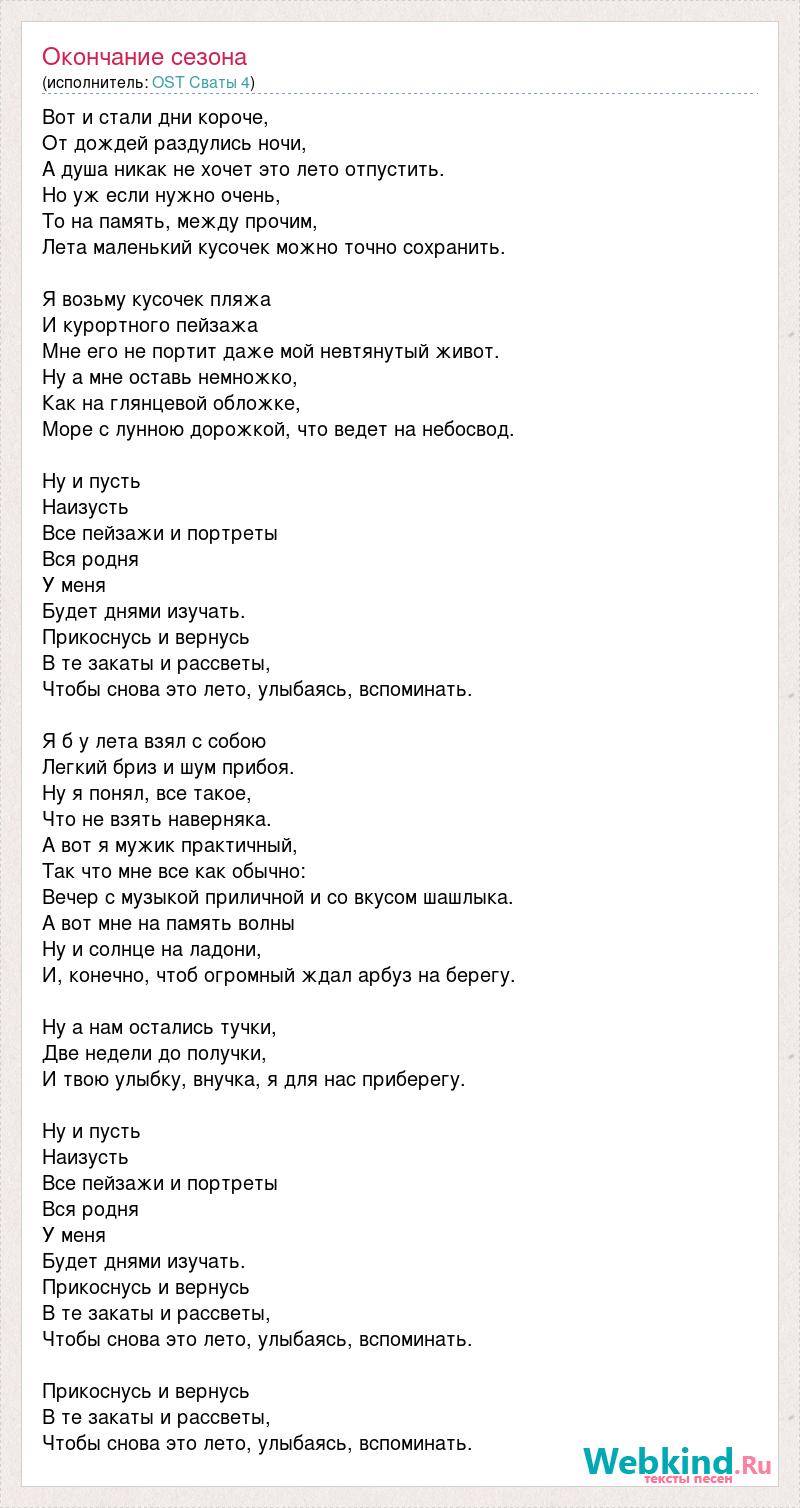 Вот и стали дни короче, От дождей раздулись ночи, А душа никак не хочет это лето отпустить. Но уж если нужно очень, То на память, между прочим, Лета маленький кусочек можно точно сохранить. Я возьму кусочек пляжа И курортного пейзажа Мне его не портит даже мой невтянутый живот. Ну а мне оставь немножко, Как на глянцевой обложке, Море с лунною дорожкой, что ведет на небосвод. Ну и пусть Наизусть Все пейзажи и портреты Вся родня У меня Будет днями изучать. Прикоснусь и вернусь В те закаты и рассветы, Чтобы снова это лето, улыбаясь, вспоминать. Я б у лета взял с собою Легкий бриз и шум прибоя. Ну я понял, все такое, Что не взять наверняка. А вот я мужик практичный, Так что мне все как обычно: Вечер с музыкой приличной и со вкусом шашлыка. А вот мне на память волны Ну и солнце на ладони, И, конечно, чтоб огромный ждал арбуз на берегу. Ну а нам остались тучки, Две недели до получки, И твою улыбку, внучка, я для нас приберегу. Ну и пусть Наизусть Все пейзажи и портреты Вся родня У меня Будет днями изучать. Прикоснусь и вернусь В те закаты и рассветы, Чтобы снова это лето, улыбаясь, вспоминать. Прикоснусь и вернусь В те закаты и рассветы, Чтобы снова это лето, улыбаясь, вспоминать.