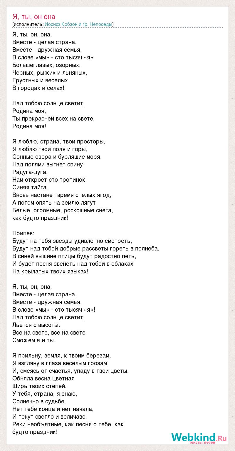 Я, ты, он, она, Вместе - целая страна. Вместе - дружная семья, В слове «мы» - сто тысяч «я» Большеглазых, озорных, Черных, рыжих и льняных, Грустных и веселых В городах и селах! Над тобою солнце светит, Родина моя, Ты прекрасней всех на свете, Родина моя! Я люблю, страна, твои просторы, Я люблю твои поля и горы, Сонные озера и бурлящие моря. Над полями выгнет спину Радуга-дуга, Нам откроет сто тропинок Синяя тайга. Вновь настанет время спелых ягод, А потом опять на землю лягут Белые, огромные, роскошные снега, как будто праздник! Припев: Будут на тебя звезды удивленно смотреть, Будут над тобой добрые рассветы гореть в полнеба. В синей вышине птицы будут радостно петь, И будет песня звенеть над тобой в облаках На крылатых твоих языках! Я, ты, он, она, Вместе - целая страна, Вместе - дружная семья, В слове «мы» - сто тысяч «я»! Над тобою солнце светит, Льется с высоты. Все на свете, все на свете Сможем я и ты. Я прильну, земля, к твоим березам, Я взгляну в глаза веселым грозам И, смеясь от счастья, упаду в твои цветы. Обняла весна цветная Ширь твоих степей. У тебя, страна, я знаю, Солнечно в судьбе. Нет тебе конца и нет начала, И текут светло и величаво Реки необъятные, как песня о тебе, как будто праздник!