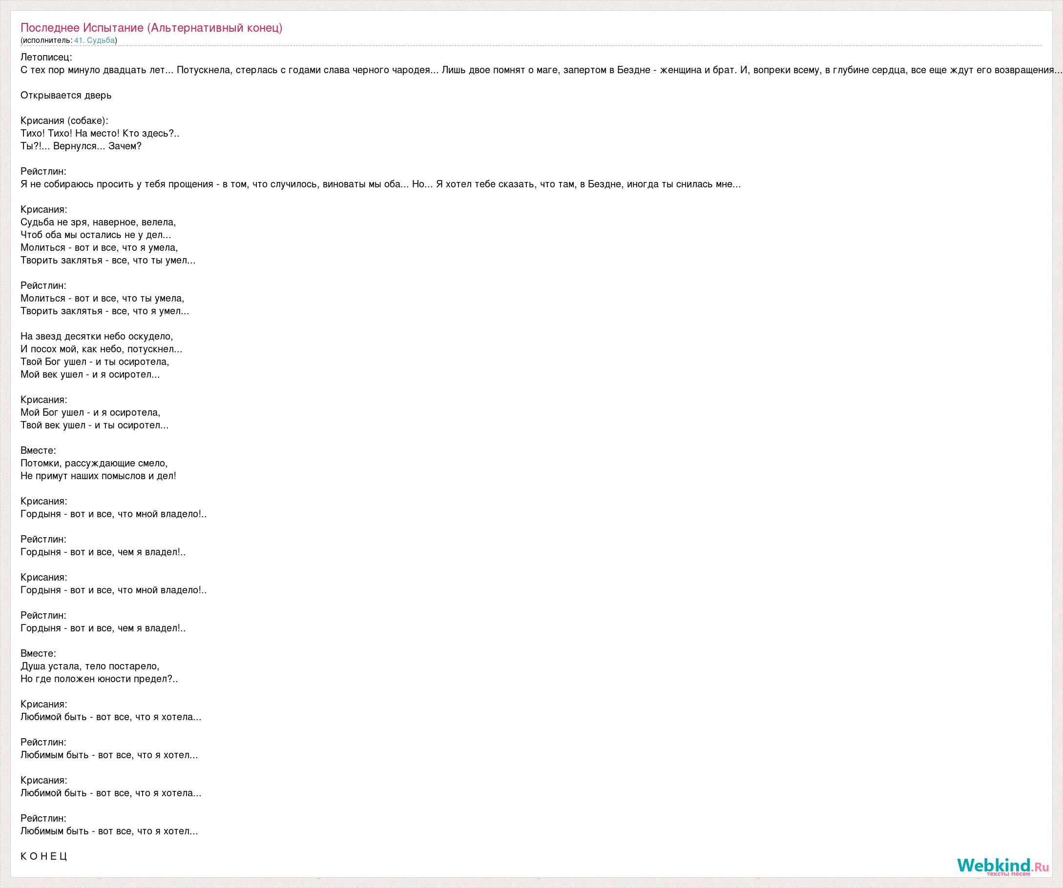 Летописец: С тех пор минуло двадцать лет... Потускнела, стерлась с годами слава черного чародея... Лишь двое помнят о маге, запертом в Бездне - женщина и брат. И, вопреки всему, в глубине сердца, все еще ждут его возвращения... Открывается дверь Крисания (собаке): Тихо! Тихо! На место! Кто здесь?.. Ты?!... Вернулся... Зачем? Рейстлин: Я не собираюсь просить у тебя прощения - в том, что случилось, виноваты мы оба... Но... Я хотел тебе сказать, что там, в Бездне, иногда ты снилась мне... Крисания: Судьба не зря, наверное, велела, Чтоб оба мы остались не у дел... Молиться - вот и все, что я умела, Творить заклятья - все, что ты умел... Рейстлин: Молиться - вот и все, что ты умела, Творить заклятья - все, что я умел... На звезд десятки небо оскудело, И посох мой, как небо, потускнел... Твой Бог ушел - и ты осиротела, Мой век ушел - и я осиротел... Крисания: Мой Бог ушел - и я осиротела, Твой век ушел - и ты осиротел... Вместе: Потомки, рассуждающие смело, Не примут наших помыслов и дел! Крисания: Гордыня - вот и все, что мной владело!.. Рейстлин: Гордыня - вот и все, чем я владел!.. Крисания: Гордыня - вот и все, что мной владело!.. Рейстлин: Гордыня - вот и все, чем я владел!.. Вместе: Душа устала, тело постарело, Но где положен юности предел?.. Крисания: Любимой быть - вот все, что я хотела... Рейстлин: Любимым быть - вот все, что я хотел... Крисания: Любимой быть - вот все, что я хотела... Рейстлин: Любимым быть - вот все, что я хотел... К О Н Е Ц