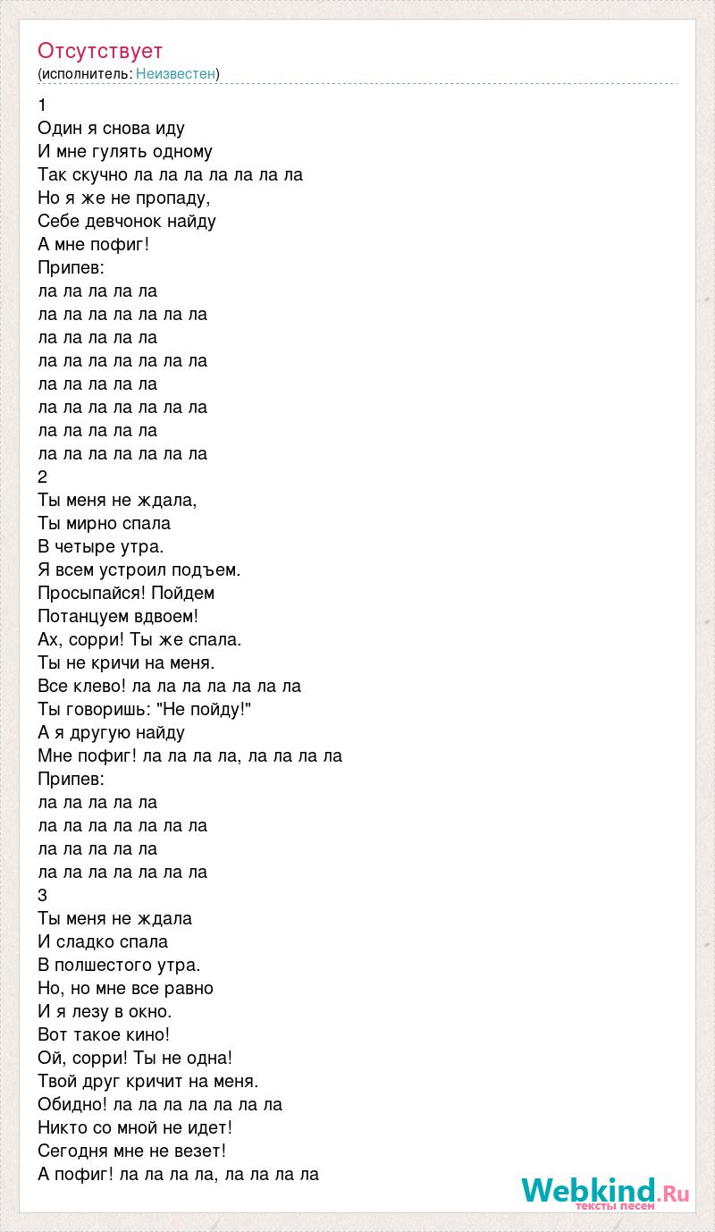 1 Один я снова иду И мне гулять одному Так скучно ла ла ла ла ла ла ла Но я же не пропаду, Себе девчонок найду А мне пофиг! Припев: ла ла ла ла ла ла ла ла ла ла ла ла ла ла ла ла ла ла ла ла ла ла ла ла ла ла ла ла ла ла ла ла ла ла ла ла ла ла ла ла ла ла ла ла ла ла ла ла 2 Ты меня не ждала, Ты мирно спала В четыре утра. Я всем устроил подъем. Просыпайся! Пойдем Потанцуем вдвоем! Ах, сорри! Ты же спала. Ты не кричи на меня. Все клево! ла ла ла ла ла ла ла Ты говоришь: "Не пойду!" А я другую найду Мне пофиг! ла ла ла ла, ла ла ла ла Припев: ла ла ла ла ла ла ла ла ла ла ла ла ла ла ла ла ла ла ла ла ла ла ла ла 3 Ты меня не ждала И сладко спала В полшестого утра. Но, но мне все равно И я лезу в окно. Вот такое кино! Ой, сорри! Ты не одна! Твой друг кричит на меня. Обидно! ла ла ла ла ла ла ла Никто со мной не идет! Сегодня мне не везет! А пофиг! ла ла ла ла, ла ла ла ла