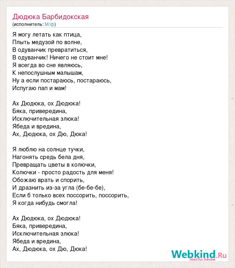 Я могу летать как птица, Плыть медузой по волне, В одуванчик превратиться, В одуванчик! Ничего не стоит мне! Я всегда во сне являюсь, К непослушным малышам, Ну а если постараюсь, постараюсь, Испугаю пап и мам! Ах Дюдюка, ох Дюдюка! Бяка, привередина, Исключительная злюка! Ябеда и вредина, Ах, Дюдюка, ох Дю, Дюка! Я люблю на солнце тучки, Нагонять средь бела дня, Превращать цветы в колючки, Колючки - просто радость для меня! Обожаю врать и спорить, И дразнить из-за угла (бе-бе-бе), Если б только всех поссорить, поссорить, Я когда нибудь смогла! Ах Дюдюка, ох Дюдюка! Бяка, привередина, Исключительная злюка! Ябеда и вредина, Ах, Дюдюка, ох Дю, Дюка!