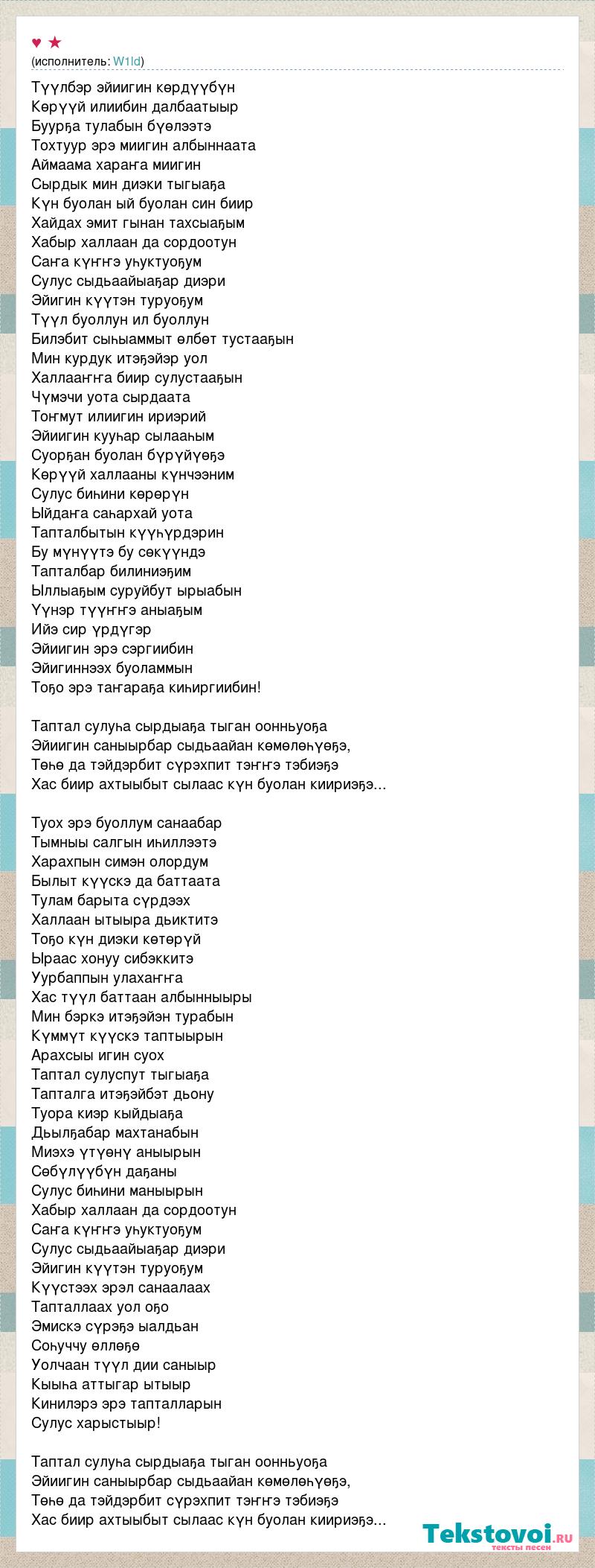 Түүлбэр эйиигин көрдүүбүн Көрүүй илиибин далбаатыыр Буурҕа тулабын бүөлээтэ Тохтуур эрэ миигин албыннаата Аймаама хараҥа миигин Сырдык мин диэки тыгыаҕа Күн буолан ый буолан син биир Хайдах эмит гынан тахсыаҕым Хабыр халлаан да сордоотун Саҥа күҥҥэ уһуктуоҕум Сулус сыдьаайыаҕар диэри Эйигин күүтэн туруоҕум Түүл буоллун ил буоллун Билэбит сыһыаммыт өлбөт тустааҕын Мин курдук итэҕэйэр уол Халлааҥҥа биир сулустааҕын Чүмэчи уота сырдаата Тоҥмут илиигин ириэрий Эйиигин кууһар сылааһым Суорҕан буолан бүрүйүөҕэ Көрүүй халлааны күнчээним Сулус биһини көрөрүн Ыйдаҥа саһархай уота Тапталбытын күүһүрдэрин Бу мүнүүтэ бу сөкүүндэ Тапталбар билиниэҕим Ыллыаҕым суруйбут ырыабын Үүнэр түүҥҥэ аныаҕым Ийэ сир үрдүгэр Эйиигин эрэ сэргиибин Эйигиннээх буоламмын Тоҕо эрэ таҥараҕа киһиргиибин! Таптал сулуһа сырдыаҕа тыган оонньуоҕа Эйиигин саныырбар сыдьаайан көмөлөһүөҕэ, Төһө да тэйдэрбит сүрэхпит тэҥҥэ тэбиэҕэ Хас биир ахтыыбыт сылаас күн буолан киириэҕэ... Туох эрэ буоллум санаабар Тымныы салгын иһиллээтэ Харахпын симэн олордум Былыт күүскэ да баттаата Тулам барыта сүрдээх Халлаан ытыыра дьиктитэ Тоҕо күн диэки көтөрүй Ыраас хонуу сибэккитэ Уурбаппын улахаҥҥа Хас түүл баттаан албынныыры Мин бэркэ итэҕэйэн турабын Күммүт күүскэ таптыырын Арахсыы игин суох Таптал сулуспут тыгыаҕа Тапталга итэҕэйбэт дьону Туора киэр кыйдыаҕа Дьылҕабар махтанабын Миэхэ үтүөнү аныырын Сөбүлүүбүн даҕаны Сулус биһини маныырын Хабыр халлаан да сордоотун Саҥа күҥҥэ уһуктуоҕум Сулус сыдьаайыаҕар диэри Эйигин күүтэн туруоҕум Күүстээх эрэл санаалаах Тапталлаах уол оҕо Эмискэ сүрэҕэ ыалдьан Соһуччу өллөҕө Уолчаан түүл дии саныыр Кыыһа аттыгар ытыыр Кинилэрэ эрэ тапталларын Сулус харыстыыр! Таптал сулуһа сырдыаҕа тыган оонньуоҕа Эйиигин саныырбар сыдьаайан көмөлөһүөҕэ, Төһө да тэйдэрбит сүрэхпит тэҥҥэ тэбиэҕэ Хас биир ахтыыбыт сылаас күн буолан киириэҕэ...