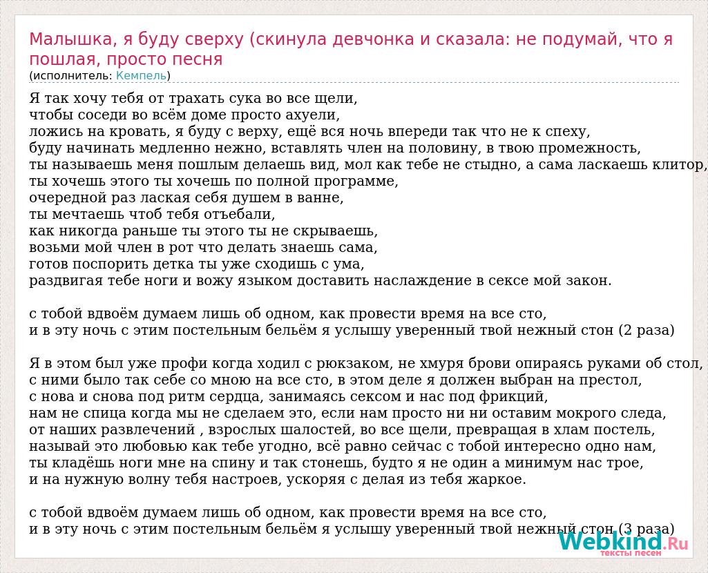 Главная→Исполнители→Кемпель→Малышка, я буду сверху (скинула девчонка и сказала: не подумай, что я пош