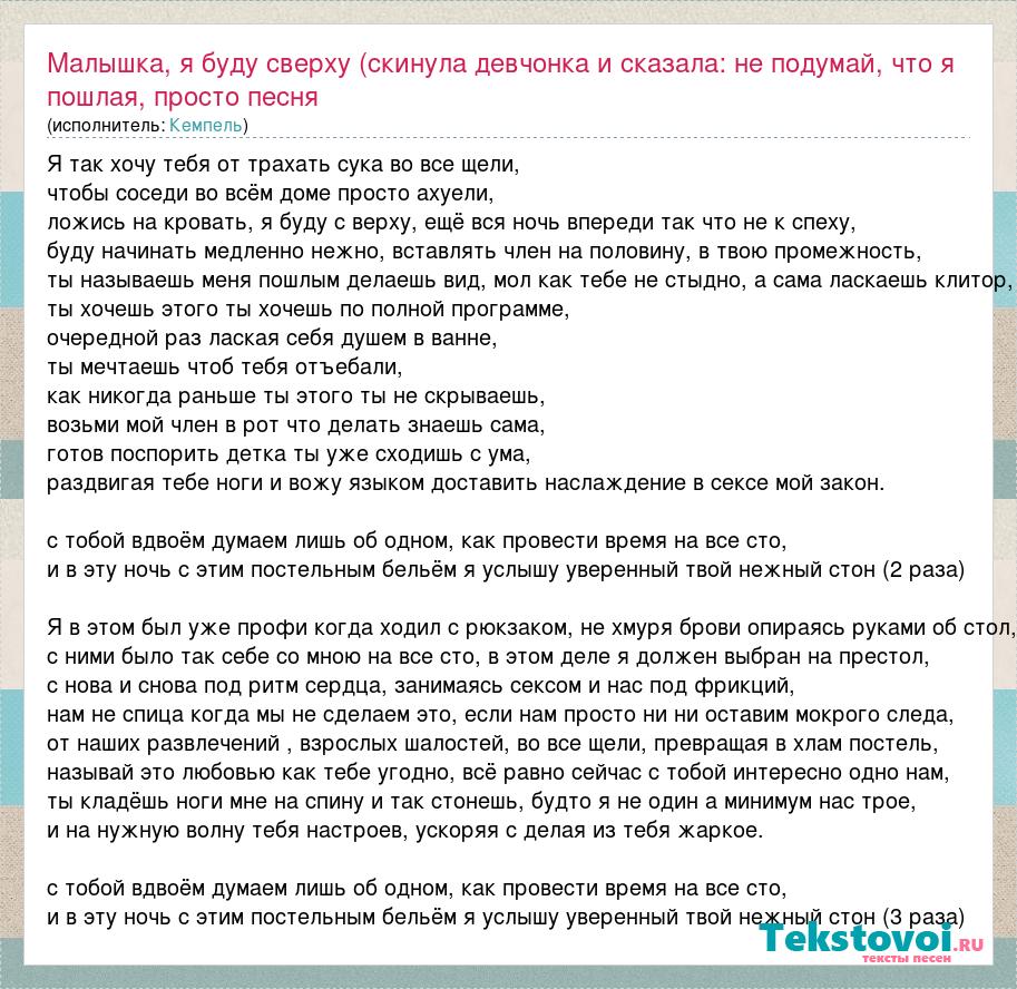 Я так хочу тебя от трахать сука во все щели, чтобы соседи во всём доме просто ахуели, ложись на кровать, я буду с верху, ещё вся ночь впереди так что не к спеху, буду начинать медленно нежно, вставлять член на половину, в твою промежность, ты называешь меня пошлым делаешь вид, мол как тебе не стыдно, а сама ласкаешь клитор, ты хочешь этого ты хочешь по полной программе, очередной раз лаская себя душем в ванне, ты мечтаешь чтоб тебя отъебали, как никогда раньше ты этого ты не скрываешь, возьми мой член в рот что делать знаешь сама, готов поспорить детка ты уже сходишь с ума, раздвигая тебе ноги и вожу языком доставить наслаждение в сексе мой закон. с тобой вдвоём думаем лишь об одном, как провести время на все сто, и в эту ночь с этим постельным бельём я услышу уверенный твой нежный стон (2 раза) Я в этом был уже профи когда ходил с рюкзаком, не хмуря брови опираясь руками об стол, с ними было так себе со мною на все сто, в этом деле я должен выбран на престол, с нова и снова под ритм сердца, занимаясь сексом и нас под фрикций, нам не спица когда мы не сделаем это, если нам просто ни ни оставим мокрого следа, от наших развлечений , взрослых шалостей, во все щели, превращая в хлам постель, называй это любовью как тебе угодно, всё равно сейчас с тобой интересно одно нам, ты кладёшь ноги мне на спину и так стонешь, будто я не один а минимум нас трое, и на нужную волну тебя настроев, ускоряя с делая из тебя жаркое. с тобой вдвоём думаем лишь об одном, как провести время на все сто, и в эту ночь с этим постельным бельём я услышу уверенный твой нежный стон (3 раза)