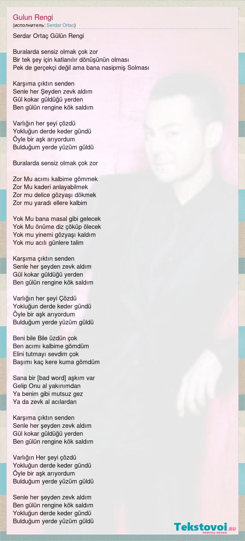 Serdar Ortaç Gülün Rengi Buralarda sensiz olmak çok zor Bir tek şey için katlanılır dönüşünün olması Pek de gerçekçi değil ama bana nasipmiş Solması Karşıma çıktın senden Senle her Şeyden zevk aldım Gül kokar güldüğü yerden Ben gülün rengine kök saldım Varlığın her şeyi çözdü Yokluğun derde keder gündü Öyle bir aşk arıyordum Bulduğum yerde yüzüm güldü Buralarda sensiz olmak çok zor Zor Mu acımı kalbime gömmek Zor Mu kaderi anlayabilmek Zor mu delice gözyaşı dökmek Zor mu yaradı ellere kalbim Yok Mu bana masal gibi gelecek Yok Mu önüme diz çöküp ölecek Yok mu yinemi gözyaşı kaldım Yok mu acılı günlere talim Karşıma çıktın senden Senle her şeyden zevk aldım Gül kokar güldüğü yerden Ben gülün rengine kök saldım Varlığın her şeyi Çözdü Yokluğun derde keder gündü Öyle bir aşk arıyordum Bulduğum yerde yüzüm güldü Beni bile Bile üzdün çok Ben acımı kalbime gömdüm Elini tutmayı sevdim çok Başımı kaç kere kuma gömdüm Sana bir [bad word] aşkım var Gelip Onu al yakınımdan Ya benim gibi mutsuz gez Ya da zevk al acılardan Karşıma çıktın senden Senle her şeyden zevk aldım Gül kokar güldüğü yerden Ben gülün rengine kök saldım Varlığın Her şeyi çözdü Yokluğun derde keder gündü Öyle bir aşk arıyordum Bulduğum yerde yüzüm güldü Senle her şeyden zevk aldım Ben gülün rengine kök saldım Yokluğun derde keder gündü Bulduğum yerde yüzüm güldü