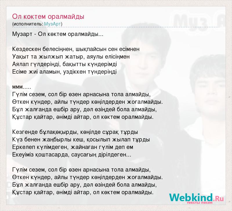 Музарт - Ол көктем оралмайды... Кездескен белесіңнен, шықпайсын сен есімнен Уақыт та жылжып жатыр, аяулы елісіңмен Аялап гүлдеріңді, бақытты күндерімді Есіме жиі аламын, уздіккен түндеріңді ммм..... Гүлім сезем, сол бір өзен арнасына тола алмайды, Өткен күндер, айлы түндер көңілдерден жоғалмайды. Бұл жалғанда ешбір ару, дәл өзіңдей бола алмайды, Құстар қайтар, әнімді айтар, ол көктем оралмайды. Кезгенде бұлақөқырды, көңілде сұрақ тұрды Күз бенен жаңбырлы кеш, қосылып жылап тұрды Еркелеп күлімдеген, жайнаған гүлім деп ем Екеуіміз қоштасарда, саусағың дірілдеген... Гүлім сезем, сол бір өзен арнасына тола алмайды, Өткен күндер, айлы түндер көңілдерден жоғалмайды. Бұл жалғанда ешбір ару, дәл өзіндей бола алмайды, Құстар қайтар, әнімді айтар, ол көктем оралмайды.