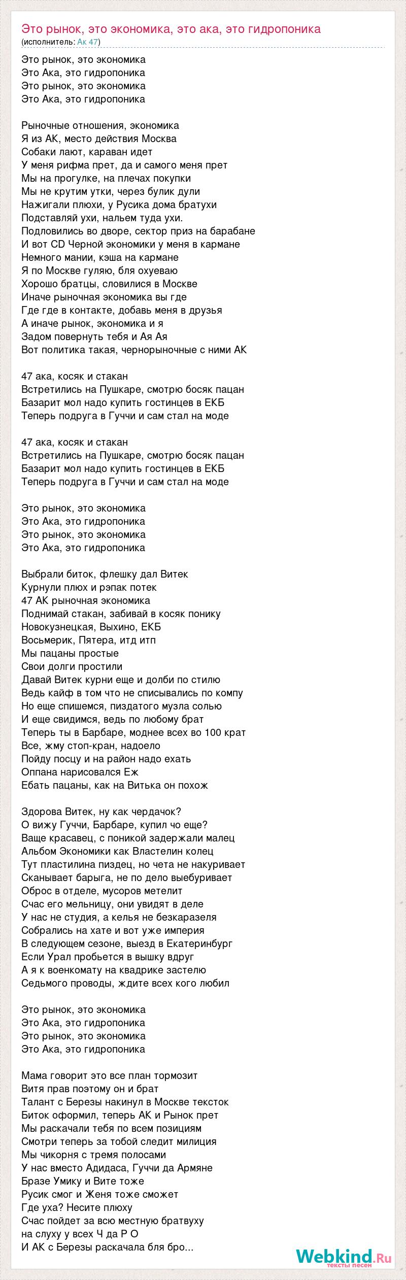 Это рынок, это экономика Это Ака, это гидропоника Это рынок, это экономика Это Ака, это гидропоника Рыночные отношения, экономика Я из АК, место действия Москва Собаки лают, караван идет У меня рифма прет, да и самого меня прет Мы на прогулке, на плечах покупки Мы не крутим утки, через булик дули Нажигали плюхи, у Русика дома братухи Подставляй ухи, нальем туда ухи. Подловились во дворе, сектор приз на барабане И вот CD Черной экономики у меня в кармане Немного мании, кэша на кармане Я по Москве гуляю, бля охуеваю Хорошо братцы, словилися в Москве Иначе рыночная экономика вы где Где где в контакте, добавь меня в друзья А иначе рынок, экономика и я Задом повернуть тебя и Ая Ая Вот политика такая, чернорыночные с ними АК 47 ака, косяк и стакан Встретились на Пушкаре, смотрю босяк пацан Базарит мол надо купить гостинцев в ЕКБ Теперь подруга в Гуччи и сам стал на моде 47 ака, косяк и стакан Встретились на Пушкаре, смотрю босяк пацан Базарит мол надо купить гостинцев в ЕКБ Теперь подруга в Гуччи и сам стал на моде Это рынок, это экономика Это Ака, это гидропоника Это рынок, это экономика Это Ака, это гидропоника Выбрали биток, флешку дал Витек Курнули плюх и рэпак потек 47 АК рыночная экономика Поднимай стакан, забивай в косяк понику Новокузнецкая, Выхино, ЕКБ Восьмерик, Пятера, итд итп Мы пацаны простые Свои долги простили Давай Витек курни еще и долби по стилю Ведь кайф в том что не списывались по компу Но еще спишемся, пиздатого музла солью И еще свидимся, ведь по любому брат Теперь ты в Барбаре, моднее всех во 100 крат Все, жму стоп-кран, надоело Пойду посцу и на район надо ехать Оппана нарисовался Еж Ебать пацаны, как на Витька он похож Здорова Витек, ну как чердачок? О вижу Гуччи, Барбаре, купил чо еще? Ваще красавец, с поникой задержали малец Альбом Экономики как Властелин колец Тут пластилина пиздец, но чета не накуривает Сканывает барыга, не по дело выебуривает Оброс в отделе, мусоров метелит Счас его мельницу, они увидят в деле У нас не студия, а келья не безкаразеля Собрались на хате и вот уже империя В следующем сезоне, выезд в Екатеринбург Если Урал пробьется в вышку вдруг А я к военкомату на квадрике застелю Седьмого проводы, ждите всех кого любил Это рынок, это экономика Это Ака, это гидропоника Это рынок, это экономика Это Ака, это гидропоника Мама говорит это все план тормозит Витя прав поэтому он и брат Талант с Березы накинул в Москве тексток Биток оформил, теперь АК и Рынок прет Мы раскачали тебя по всем позициям Смотри теперь за тобой следит милиция Мы чикорня с тремя полосами У нас вместо Адидаса, Гуччи да Армяне Бразе Умику и Вите тоже Русик смог и Женя тоже сможет Где уха? Несите плюху Счас пойдет за всю местную братвуху на слуху у всех Ч да Р О И АК с Березы раскачала бля бро...