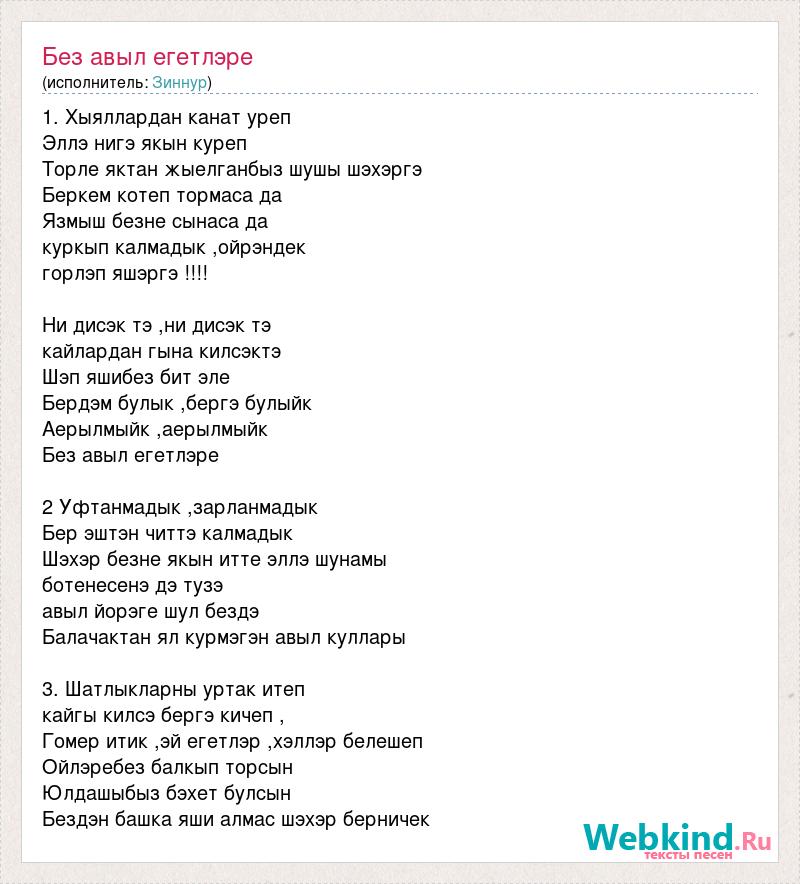 1. Хыяллардан канат уреп Эллэ нигэ якын куреп Торле яктан жыелганбыз шушы шэхэргэ Беркем котеп тормаса да Язмыш безне сынаса да куркып калмадык ,ойрэндек горлэп яшэргэ !!!! Ни дисэк тэ ,ни дисэк тэ кайлардан гына килсэктэ Шэп яшибез бит эле Бердэм булык ,бергэ булыйк Аерылмыйк ,аерылмыйк Без авыл егетлэре 2 Уфтанмадык ,зарланмадык Бер эштэн читтэ калмадык Шэхэр безне якын итте эллэ шунамы ботенесенэ дэ тузэ авыл йорэге шул бездэ Балачактан ял курмэгэн авыл куллары 3. Шатлыкларны уртак итеп кайгы килсэ бергэ кичеп , Гомер итик ,эй егетлэр ,хэллэр белешеп Ойлэребез балкып торсын Юлдашыбыз бэхет булсын Бездэн башка яши алмас шэхэр берничек