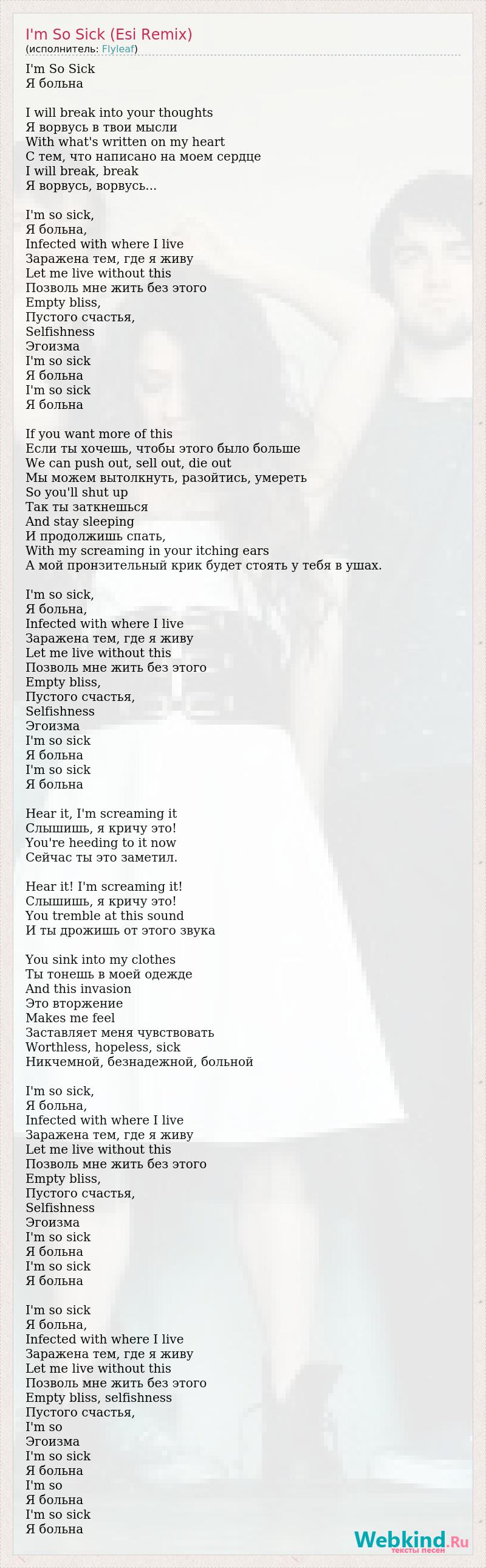 I'm So Sick Я больна I will break into your thoughts Я ворвусь в твои мысли With what's written on my heart С тем, что написано на моем сердце I will break, break Я ворвусь, ворвусь... I'm so sick, Я больна, Infected with where I live Заражена тем, где я живу Let me live without this Позволь мне жить без этого Empty bliss, Пустого счастья, Selfishness Эгоизма I'm so sick Я больна I'm so sick Я больна If you want more of this Если ты хочешь, чтобы этого было больше We can push out, sell out, die out Мы можем вытолкнуть, разойтись, умереть So you'll shut up Так ты заткнешься And stay sleeping И продолжишь спать, With my screaming in your itching ears А мой пронзительный крик будет стоять у тебя в ушах. I'm so sick, Я больна, Infected with where I live Заражена тем, где я живу Let me live without this Позволь мне жить без этого Empty bliss, Пустого счастья, Selfishness Эгоизма I'm so sick Я больна I'm so sick Я больна Hear it, I'm screaming it Слышишь, я кричу это! You're heeding to it now Сейчас ты это заметил. Hear it! I'm screaming it! Слышишь, я кричу это! You tremble at this sound И ты дрожишь от этого звука You sink into my clothes Ты тонешь в моей одежде And this invasion Это вторжение Makes me feel Заставляет меня чувствовать Worthless, hopeless, sick Никчемной, безнадежной, больной I'm so sick, Я больна, Infected with where I live Заражена тем, где я живу Let me live without this Позволь мне жить без этого Empty bliss, Пустого счастья, Selfishness Эгоизма I'm so sick Я больна I'm so sick Я больна I'm so sick Я больна, Infected with where I live Заражена тем, где я живу Let me live without this Позволь мне жить без этого Empty bliss, selfishness Пустого счастья, I'm so Эгоизма I'm so sick Я больна I'm so Я больна I'm so sick Я больна