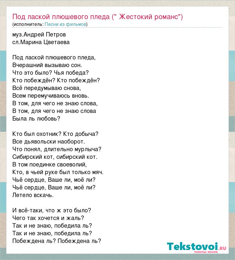 муз.Андрей Петров сл.Марина Цветаева Под лаской плюшевого пледа, Вчерашний вызываю сон. Что это было? Чья победа? Кто побеждён? Кто побеждён? Всё передумываю снова, Всем перемучиваюсь вновь. В том, для чего не знаю слова, В том, для чего не знаю слова Была ль любовь? Кто был охотник? Кто добыча? Все дьявольски наоборот. Что понял, длительно мурлыча? Сибирский кот, сибирский кот. В том поединке своеволий, Кто, в чьей руке был только мяч. Чьё сердце, Ваше ли, моё ли? Чьё сердце, Ваше ли, моё ли? Летело вскачь. И всё-таки, что ж это было? Чего так хочется и жаль? Так и не знаю, победила ль? Так и не знаю, победила ль? Побеждена ль? Побеждена ль?