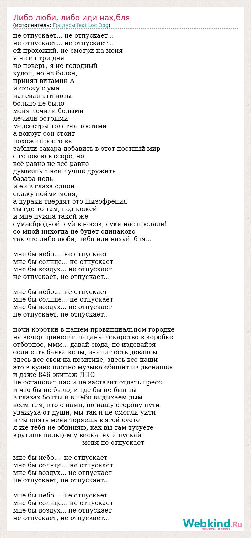 не отпускает... не отпускает... не отпускает... не отпускает... ей прохожий, не смотри на меня я не ел три дня но поверь, я не голодный худой, но не болен, принял витамин А и схожу с ума напевая эти ноты больно не было меня лечили белыми лечили острыми медсестры толстые тостами а вокруг сон стоит похоже просто вы забыли сахара добавить в этот постный мир с головою в ссоре, но всё равно не всё равно думаешь с ней лучше дружить базара ноль и ей в глаза одной скажу пойми меня, а дураки твердят это шизофрения ты где-то там, под кожей и мне нужна такой же сумасбродной. суй в носок, суки нас продали! со мной никогда не будет одинаково так что либо люби, либо иди нахуй, бля... мне бы небо.... не отпускает мне бы солнце... не отпускает мне бы воздух... не отпускает не отпускает, не отпускает... мне бы небо.... не отпускает мне бы солнце... не отпускает мне бы воздух... не отпускает не отпускает, не отпускает... ночи коротки в нашем провинциальном городке на вечер принесли пацаны лекарство в коробке отборное, ммм... давай сюда, не издевайся если есть банка колы, значит есть девайсы здесь все свои на позитиве, здесь все наши это в кузне плотно музыка ебашит из двенашек и даже 846 экипаж ДПС не остановит нас и не заставит отдать пресс и что бы не было, и где бы не был ты в глазах болты и в небо выдыхаем дым всем тем, кто с нами, по нашу сторону пути уважуха от души, мы так и не смогли уйти и ты опять меня теряешь в этой суете я же тебя не обвиняю, как вы там тусуете крутишь пальцем у виска, ну и пускай ______________________меня не отпускает мне бы небо.... не отпускает мне бы солнце... не отпускает мне бы воздух... не отпускает не отпускает, не отпускает... мне бы небо.... не отпускает мне бы солнце... не отпускает мне бы воздух... не отпускает не отпускает, не отпускает...