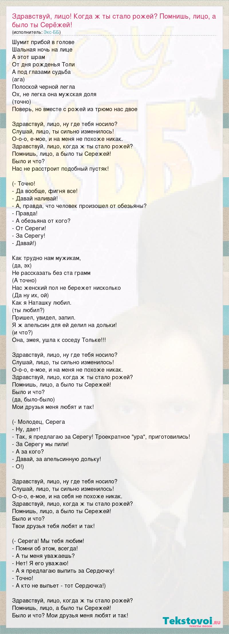 Главная→Исполнители→Экс-Бб→Здравствуй, лицо! Когда ж ты стало рожей? Помнишь, лицо, а было ты Серёже