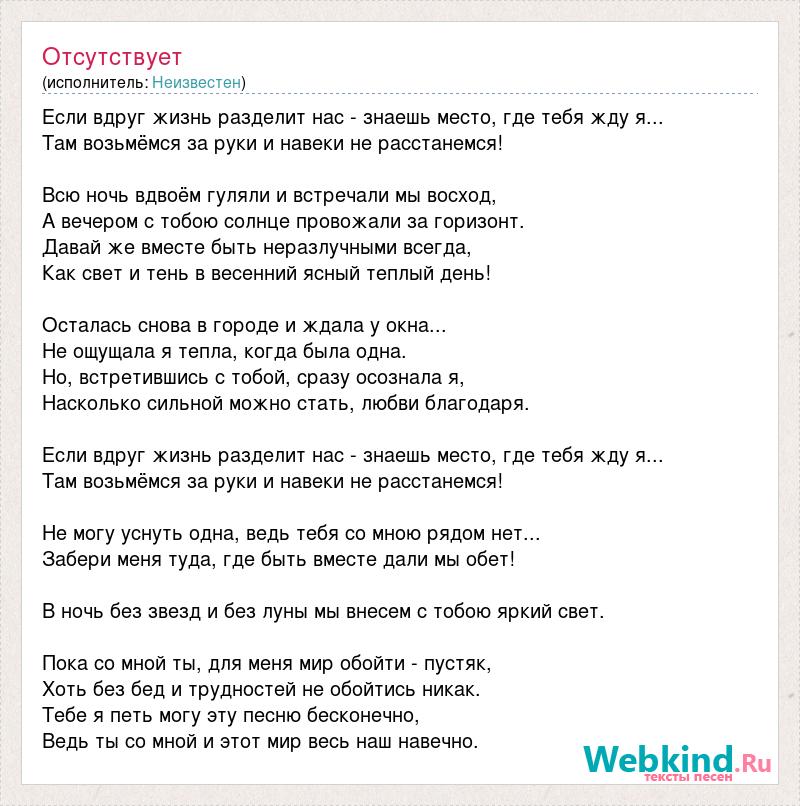 Если вдруг жизнь разделит нас - знаешь место, где тебя жду я... Там возьмёмся за руки и навеки не расстанемся! Всю ночь вдвоём гуляли и встречали мы восход, А вечером с тобою солнце провожали за горизонт. Давай же вместе быть неразлучными всегда, Как свет и тень в весенний ясный теплый день! Осталась снова в городе и ждала у окна... Не ощущала я тепла, когда была одна. Но, встретившись с тобой, сразу осознала я, Насколько сильной можно стать, любви благодаря. Если вдруг жизнь разделит нас - знаешь место, где тебя жду я... Там возьмёмся за руки и навеки не расстанемся! Не могу уснуть одна, ведь тебя со мною рядом нет... Забери меня туда, где быть вместе дали мы обет! В ночь без звезд и без луны мы внесем с тобою яркий свет. Пока со мной ты, для меня мир обойти - пустяк, Хоть без бед и трудностей не обойтись никак. Тебе я петь могу эту песню бесконечно, Ведь ты со мной и этот мир весь наш навечно.