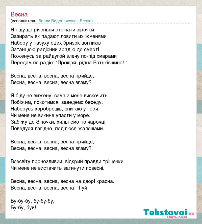 Я пiду до рiченьки стрiчати зiрочки Зазирать як падают ловити их жменями Наберу у пазуху оцих бризок-вогникiв Затанцюю радiсний зрадiю до смертi Поженусь за райдугой злечу по-пiд хмарами Передам по радiо: "Прощай, рiдна Батькiвщино! " Весна, весна, весна, весна прийде, Весна, весна, весна, весна вгаму?. Я бiду не вижену, сама з мене вискочить. Побiжим, покотимся, заведемо беседу. Наберусь хороброщiв, спитаю у горя, Чи мене не викине упасти у море. Забiжу до Зiночки, хильнемо по чарочцi, Поведуся лагiдно, подiлюся жалощами. Весна, весна, весна, весна прийде, Весна, весна, весна, весна вгаму?. Всесвiту пронозливий, вiдкрий правди трiшечки Чи мене не вистачить загинути повеснi. Весна, весна, весна, весна на дворi красна. Весна, весна, весна, весна - Гуй! Бу-бу-бу, бу-бу-бу, Бу-бу, буй!